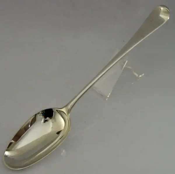 A very rare English Georgian antique solid sterling silver basting spoon. It is hallmarked for London 1753 with the maker being difficult to decipher. It has been superbly designed and has been engraved with a crest used by the Gray Family. It is in superb condition having no serious dings splits distortions or repairs. It measures approx. 11 inches (28cm) long by 2 inches (5.1cm) wide and weighs 114 grams. A very interesting piece.