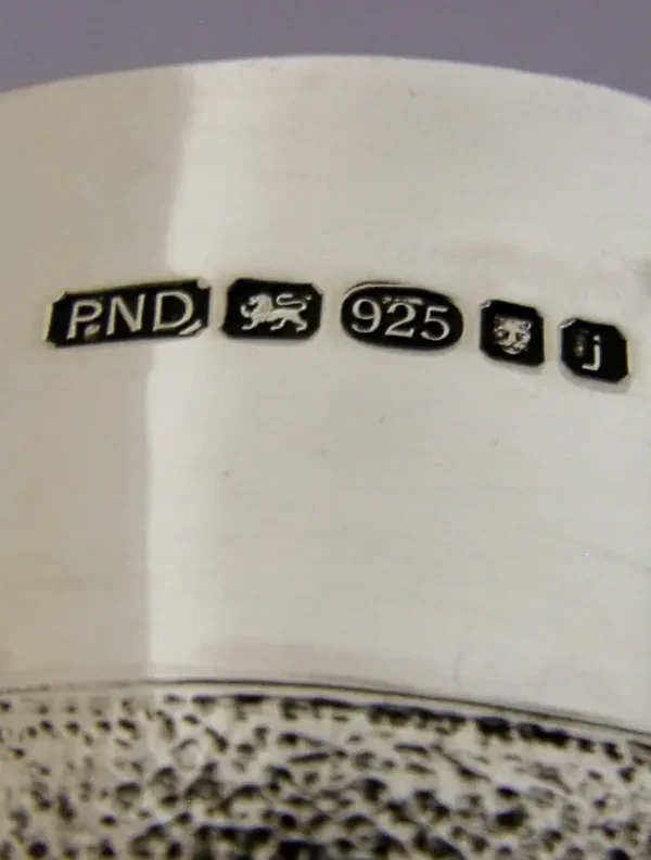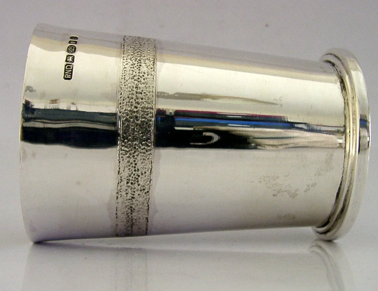 A very stylish English solid sterling silver tumbler cup. It is hallmarked for London 2008 with the maker being PND. It is been superbly designed being hand made with a textured band. It is in superb condition being free from dings splits holes and repairs. It measures over 3.5 inches (9.25cm) tall by over 2.5 inches across the rim by over 2.25 inches (6cm) across the base and is heavy weighting 170 grams. A superbly designed piece.