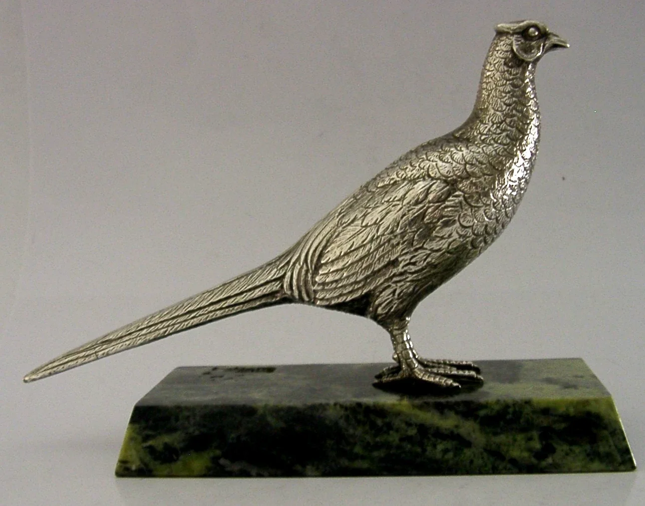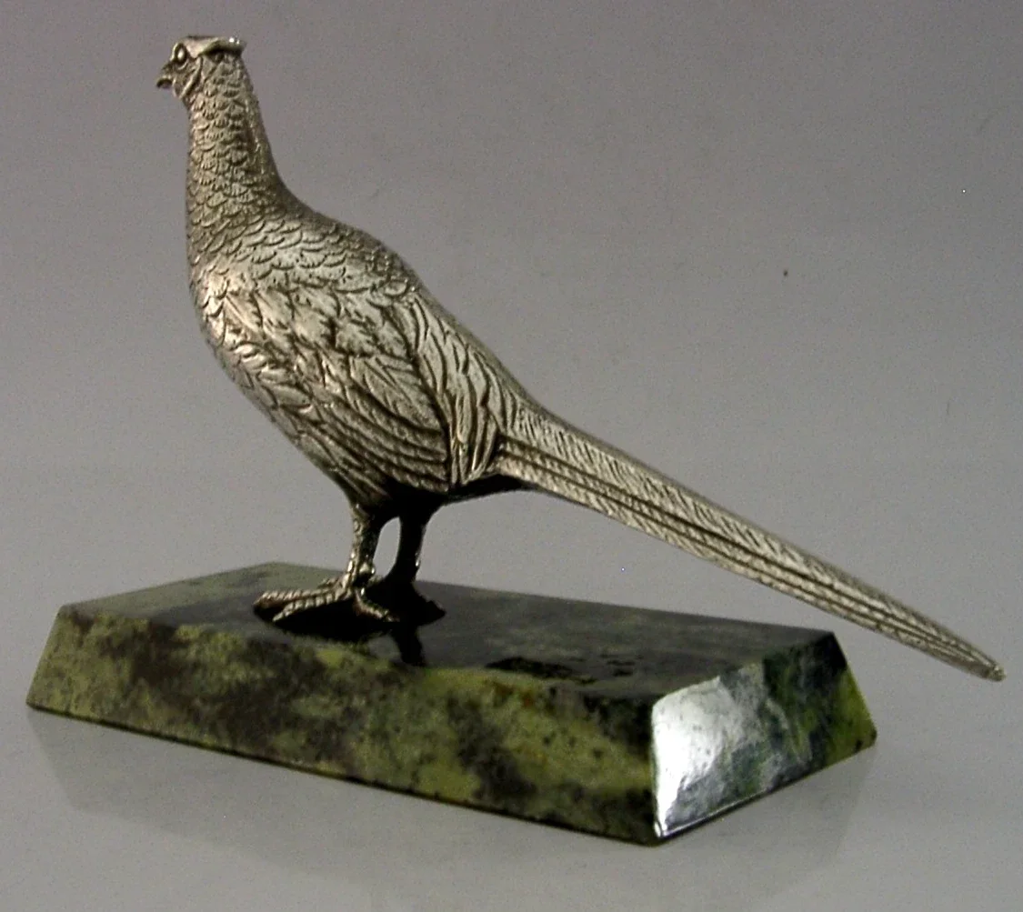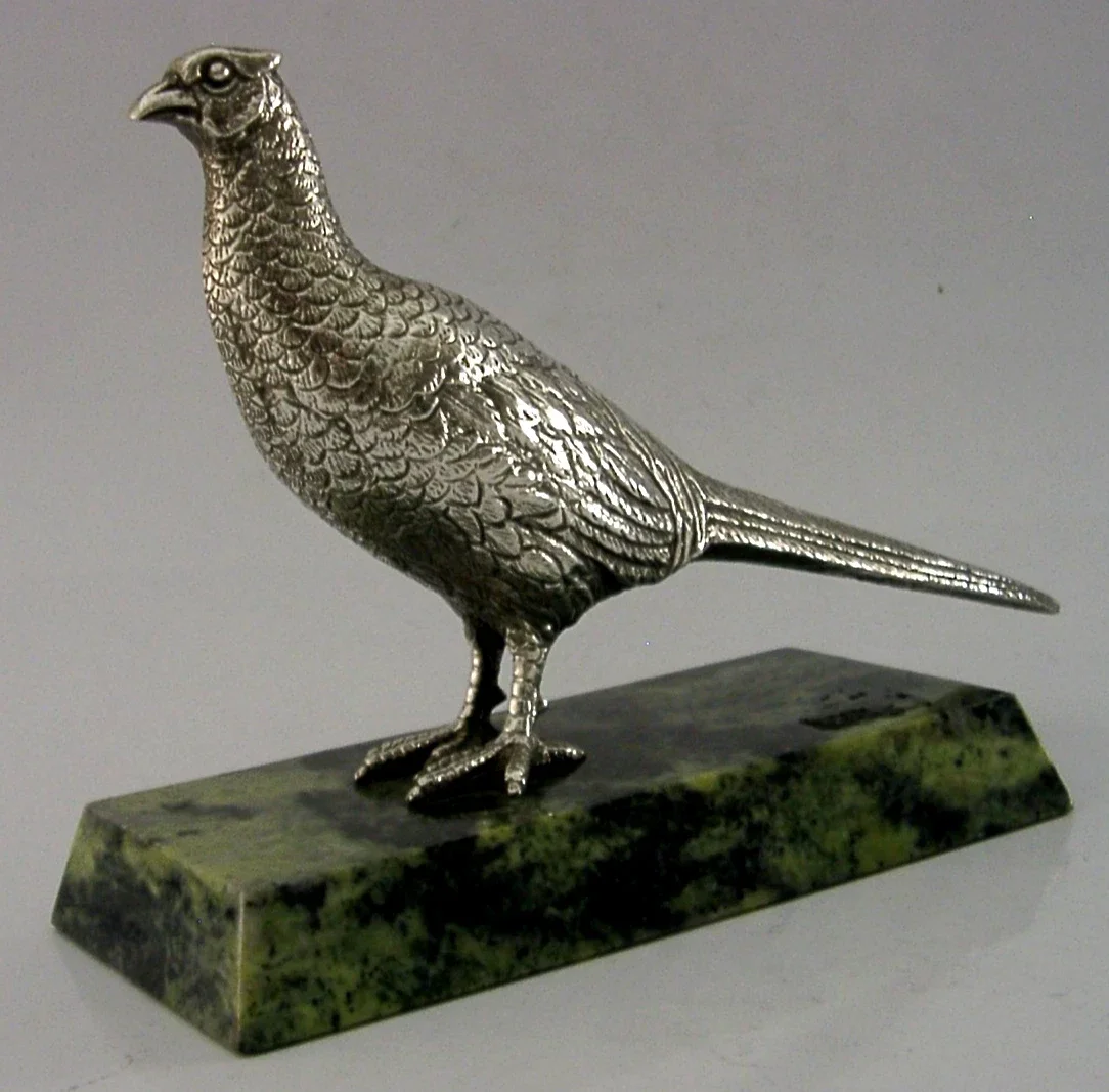 A superbly modelled good sized sterling silver desk pheasant. It is hallmarked for Birmingham 1970 with the makers marks being A E Jones. It has been beautifully modelled being finely cast and mounted on a green marble base. It is in super condition being free from dings splits and repairs. The base is free from chips cracks and repairs. It measures approx. 6 inches (15cm) long by 4.25 inches (11cm) tall and weighs 430 grams (including the base). A very well designed high quality piece.