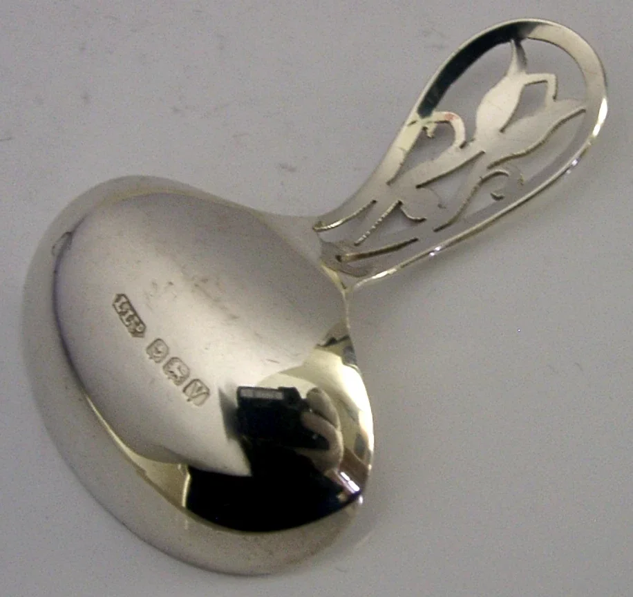 A super quality English solid sterling silver caddy spoon. It is hallmarked for Birmingham 1945 with the maker being Lanson Ltd. It has been beautifully designed having a broad bowl and pierced handle. It is in super condition being free from dings splits holes and repairs. It measures approx. 2.75 inches (6.8cm) long by 1.75 inches (4.6cm) wide and weighs 20 grams. A beautifully made example.