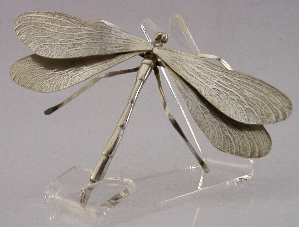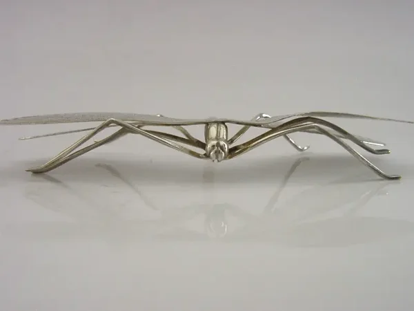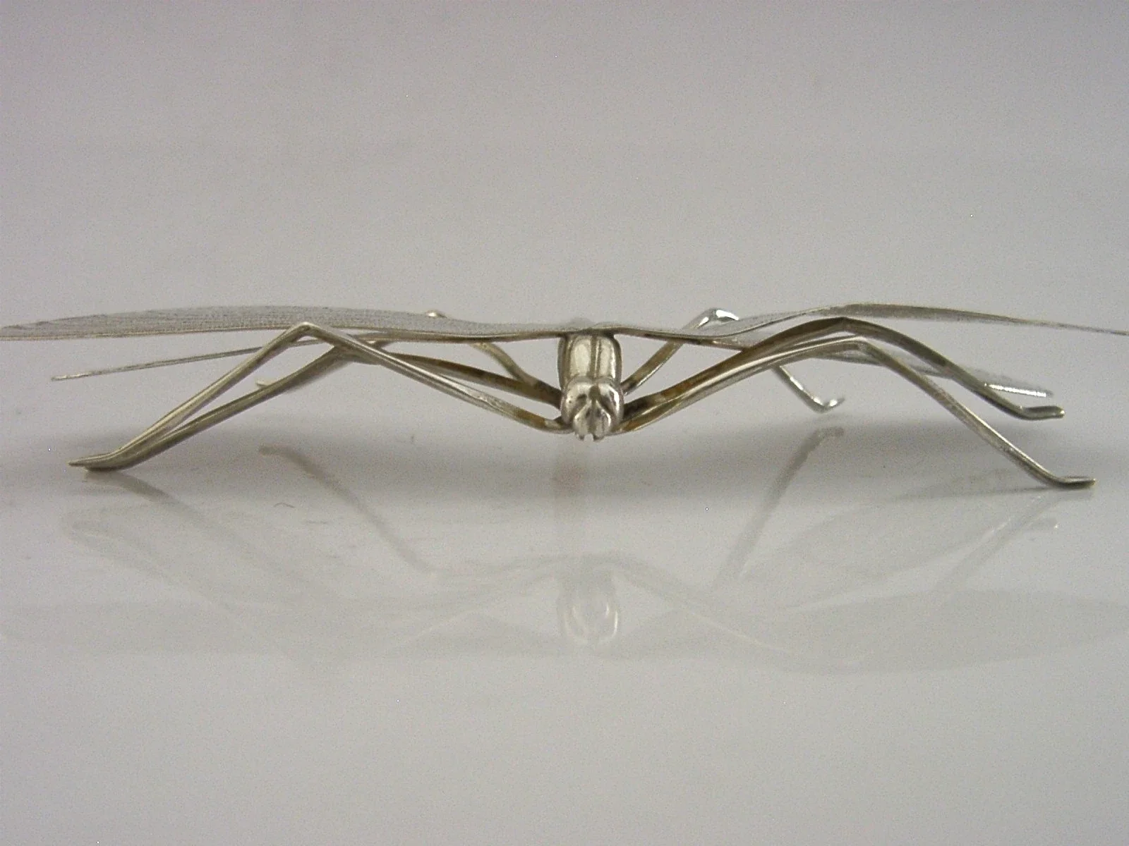 A beautiful hand made English solid sterling silver pretty much life sized insect. It is hallmarked for London 1980 with the maker being RT. It has been beautifully designed being made in the form of a dragonfly. It is in perfect condition being free from dings splits and repairs, it comes boxed. It measures over 2.5 inches (6.5cm) long by almost 4 inches (10cm) wide and weighs 16 grams excluding the box. A well made more unusual piece.