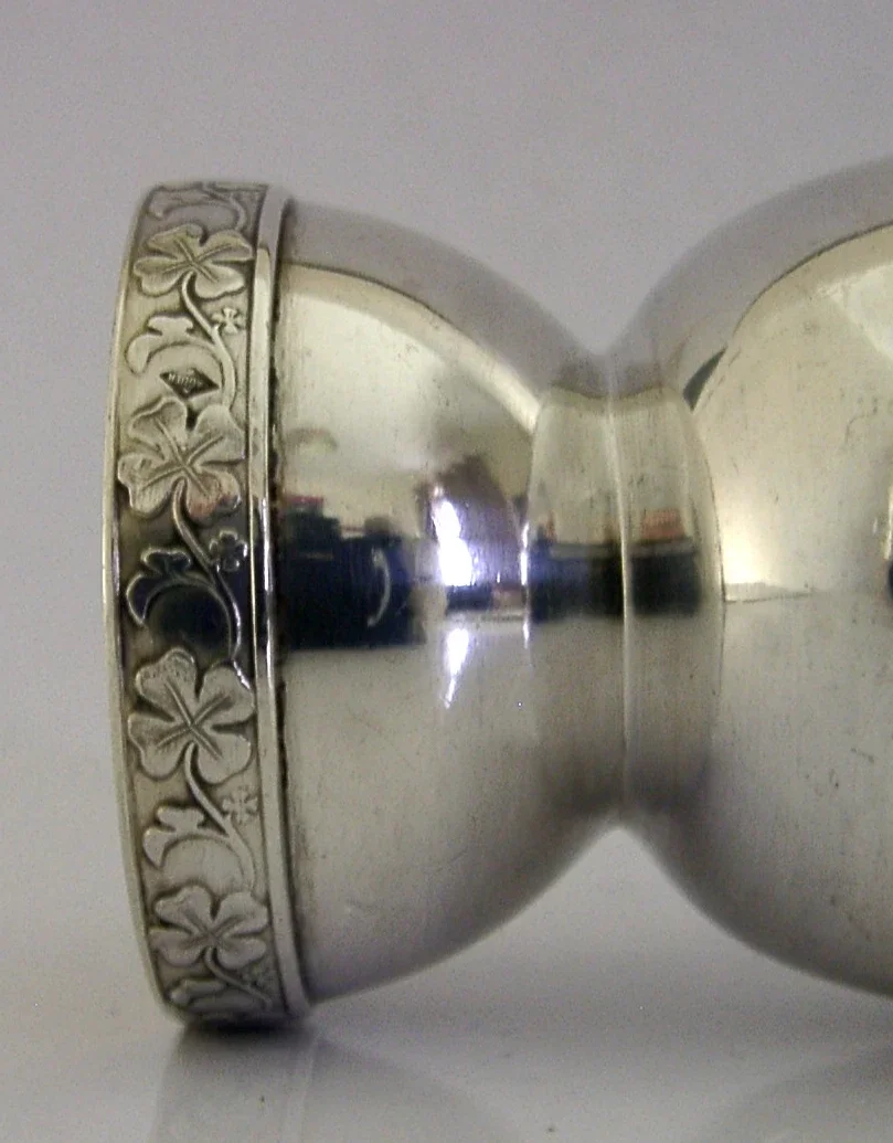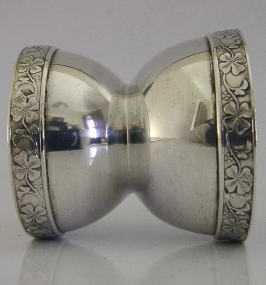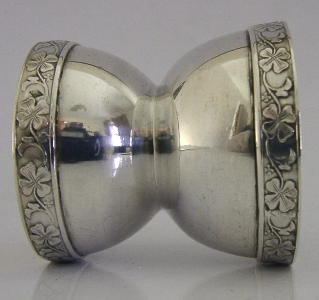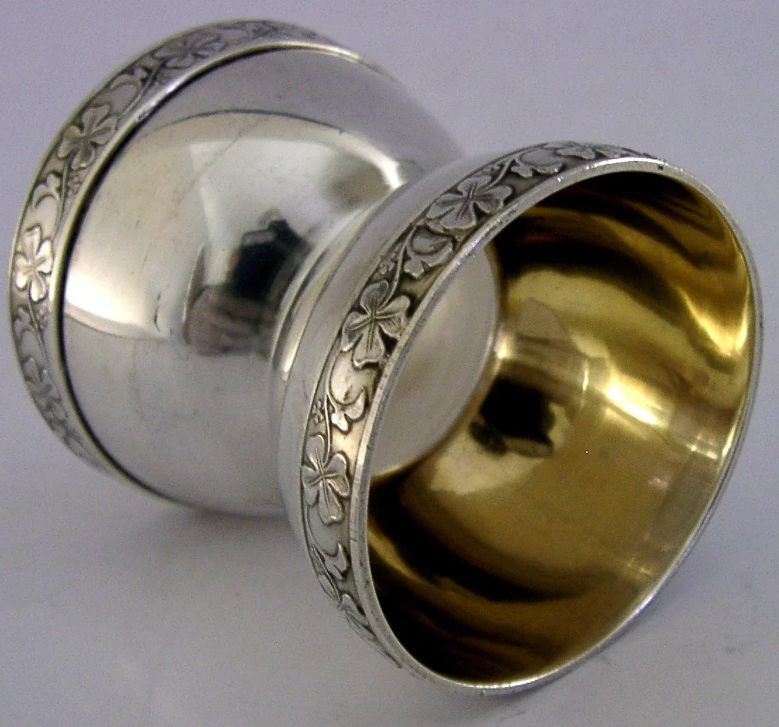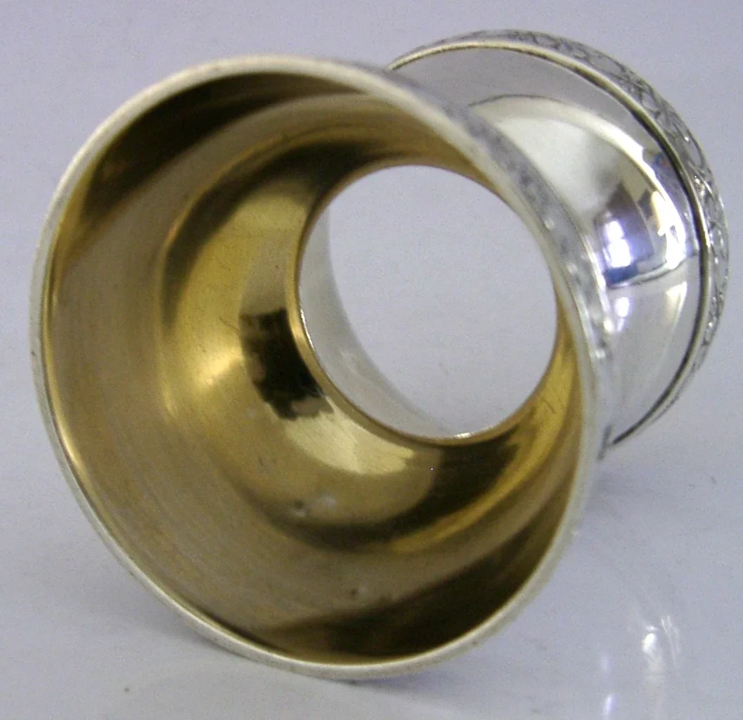 A beautiful French solid sterling silver double ended egg cup. It is hallmarked with the Minerva 950 silver standard mark and maker being Alexandre Vaguer who registered in January 15th 1884, location 114 Rue du Temple in the Marais area of Paris. I would date it to c1890s. It has been beautifully designed being internally gilded having two different sized egg cups at either end. It is in superb condition being free from dings splits and repairs, just the odd tiny mark. It measures 1.75 inches (4.4cm) across the smaller cup and over 1.75 inches (4.8cm) across the larger one by almost 2 inches (4.8cm) tall and weighs 42 grams. A very nice clean useable piece.