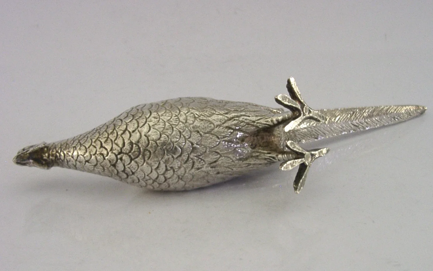 A superbly modelled silver plate animal figure. It is marked SILVER PLATED and it dates to c1950s-1970's. It has been beautifully modelled being finely cast in the form of a male cock pheasant. It is in super condition being free from dings splits and repairs. All the silver plate is original and complete. It measures over 6.5 inches (16.8cm) long beak to tail by 1.25 inch (3.2cm) wide by 3.25 inches (8.2cm) tall and weighs 336 grams. A very well designed high quality example.