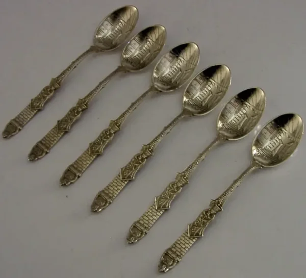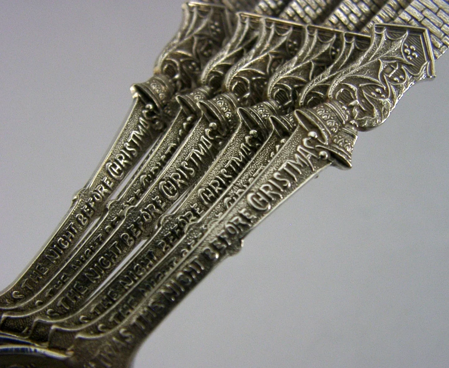 A superb set of six English Victorian antique silver plated Christmas spoons. They are marked L&w (Anchor) S for Lee and Wigful of Sheffield who operated during the late 19th early 20th centuries. They have been unusually designed depicting Santa coming down the chimney with stockings over the fireplace. They are in superb condition being free from dings splits and repairs, no wear. They measures approx. 4.25 inches (11cms) long and have a combined weight of 59 grams. A very nice quality unusual set.