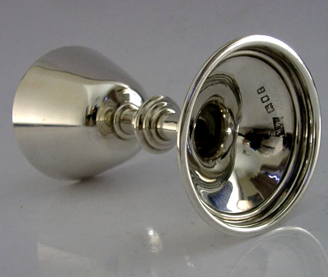 A very nicely made mint English solid sterling silver travelling communion chalice. It is hallmarked for London 1920 with the maker being Mappin and Webb. It has been superbly designed and is in perfect condition being free from dings splits distortions and repairs. It measures approx. 3.75 inches (9.4cm) tall by 2 inches at the rim and weighs 68 grams. A very good quality piece.