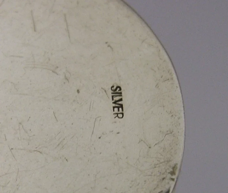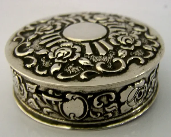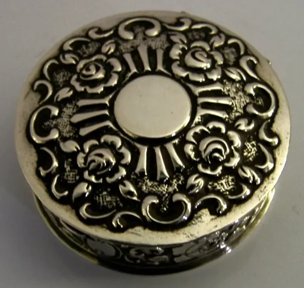 A pretty solid silver pill box. It is hallmarked SILVER and tests as such. I would date it to c1950s. It has been superbly made being decorated with roses. It is in super condition being free from dings splits holes and repairs, nicely gilded inside. It closes tightly. It measures over 1.5 inches (4.2cm) across by 0.5 inch (1.4cm) tall and weighs 26 grams. A very well made piece.