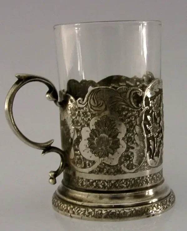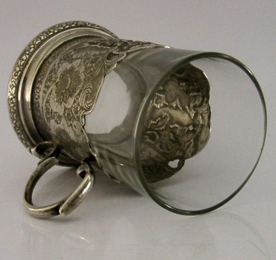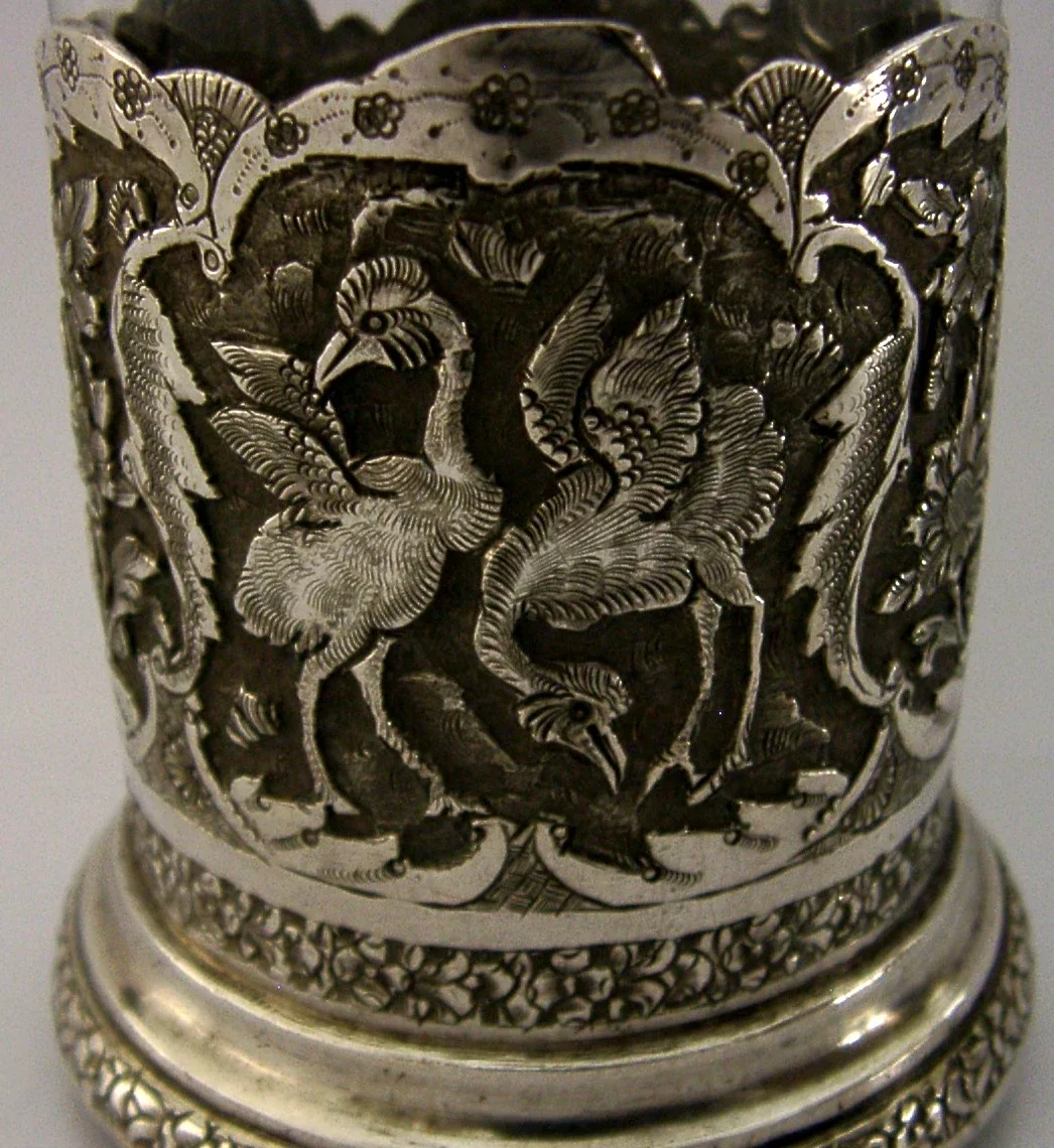 A beautiful Persian solid silver tea cup / glass. It is hallmarked with Persian or Ottoman silver marks and tests as 840 silver standard. I would date it to c1920-1940. It has been superbly designed being decorated with birds and is in superb condition being free from chips cracks dings splits and repairs. It measures approx. 3.5 inches (9cm) tall by almost the same wide including the handle. It weighs 150 grams including the glass and 76 grams excluding it. A beautifully made piece.