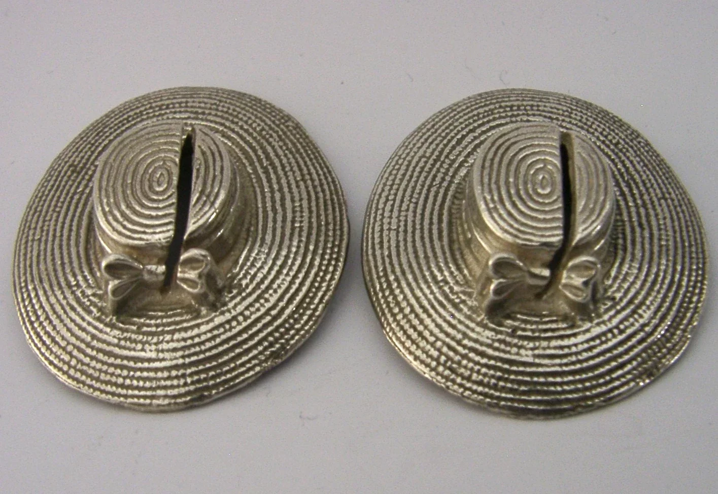 A superbly cast pair of English solid sterling silver novelty menu holders. They are both hallmarked for London 2018 with the makers marks being E&J. They have been superbly designed being cast in the form of a straw hats with bow. They are in superb condition being free from dings splits and repairs. They measures approx. 1.5 inch (4cm) by a touch less (3.5cm) wide and combined weigh 34 grams. A beautiful and unusual pair.
