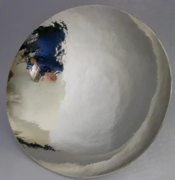 A beautiful large English hand made Arts & Crafts style solid sterling silver fruit bowl. It is hallmarked for London 2006 with the maker being Peter Morton Browne. It has been superbly designed being hand plannished. It is in superb condition being free from dings splits holes and repairs, just the the odd faint mark. It measures approx. 9 inches (23cm) across by over 2 inches (5.6cm) tall and weighs 520 grams. A stunning piece.