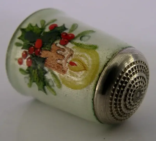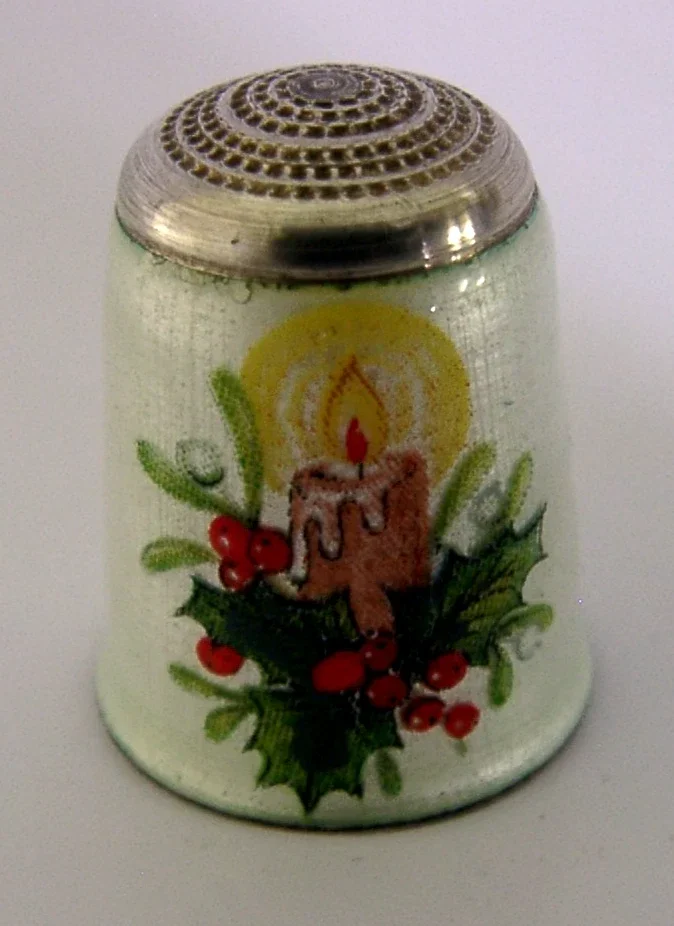 A beautiful English solid sterling silver and enamelled thimble. It is hallmarked for Birmingham 1987 with the maker being James Swann & Son. It has been superbly designed depicting a burning candle and holly. It is in super condition being free from dings splits holes and repairs. No chips or cracks. It measures approx. 1 inch (2.5cm) tall and weighs 6 grams. A very beautiful example.