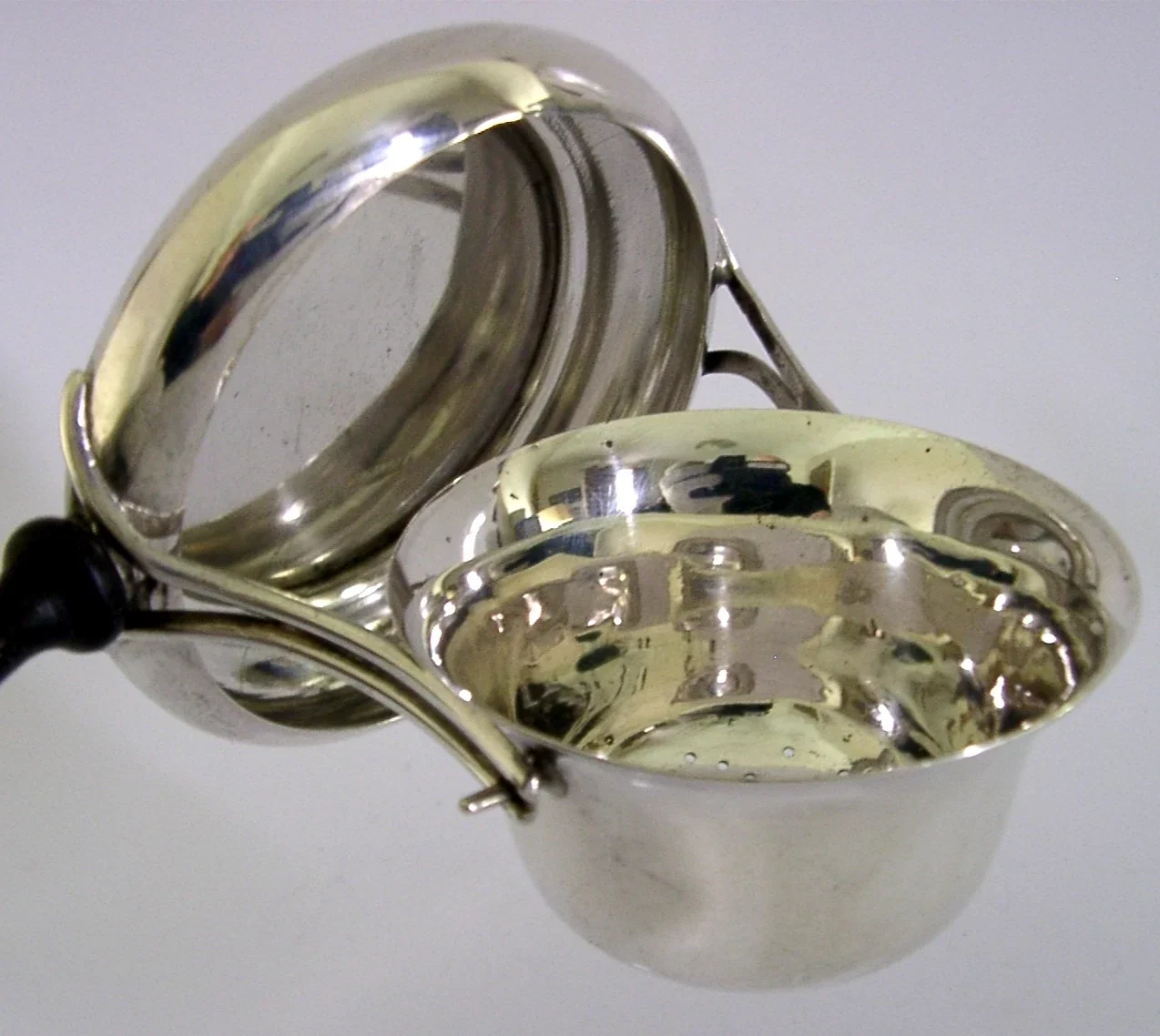 RARE ENGLISH STERLING SILVER TILTING TEA STRAINER & DRIP BOWL STAND 1928
