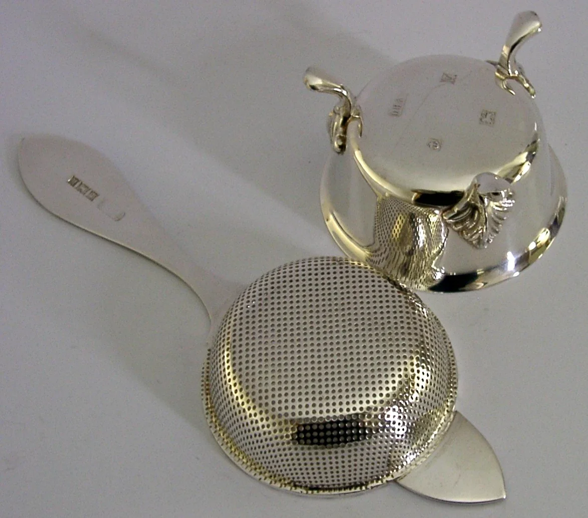ENGLISH SOLID STERLING SILVER TEA STRAINER & DRIP BOWL STAND 1971