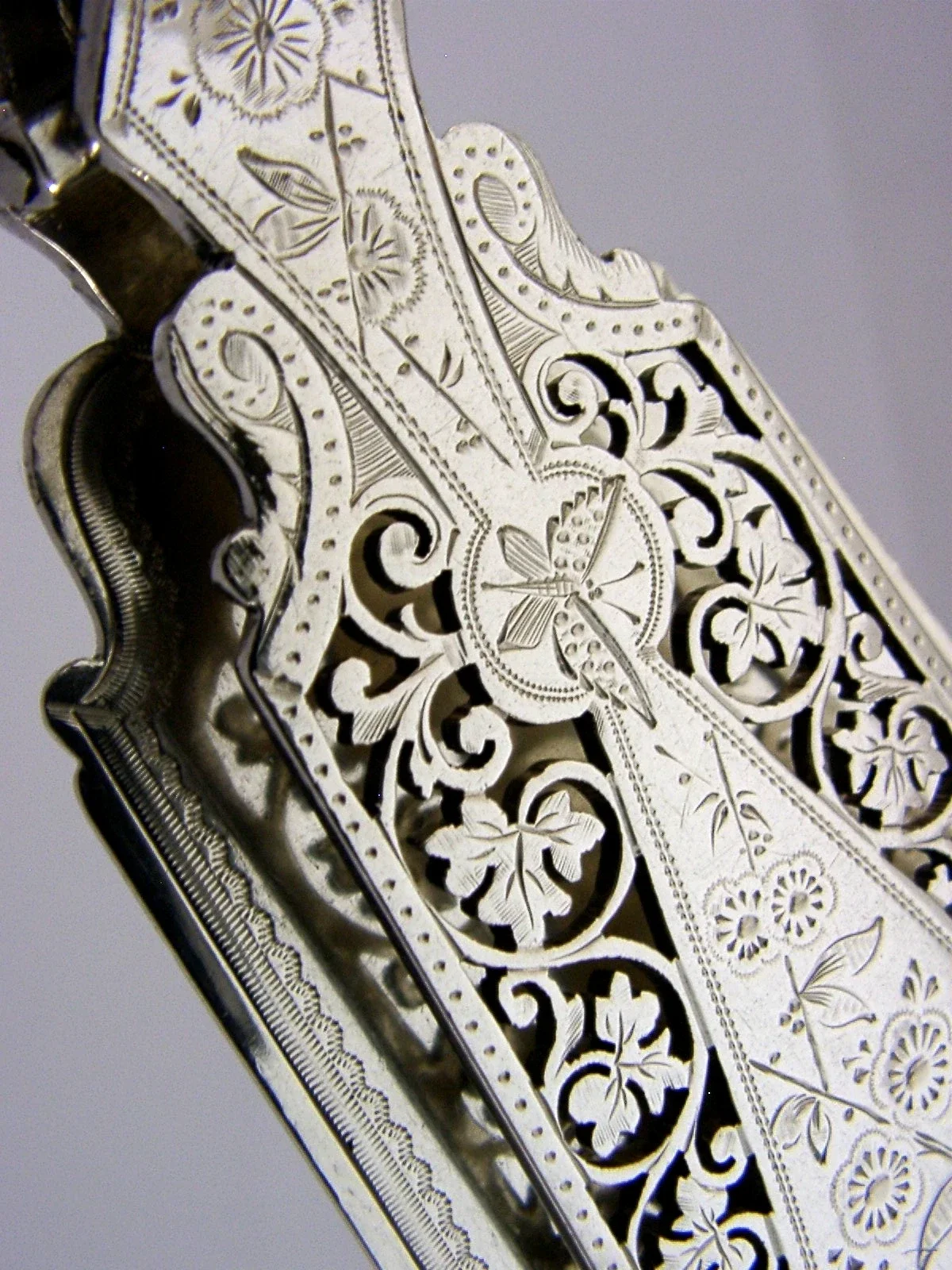 Very high quality English Victorian antique solid sterling silver serving tongs. They are hallmarked for Sheffield 1889 with the maker being JKB. They have a stunning Japanese influenced design incorporating butterflies and have been engraved with the crest of the Bingley Family. They are highly sprung and in good working order. They are in superb condition being free from dings splits distortions and repairs. They measure approx. 10.75 inches (27.4cm) long by 2.25 inches (5.8cm) wide and they weigh an impressive 178 grams. Super quality examples.