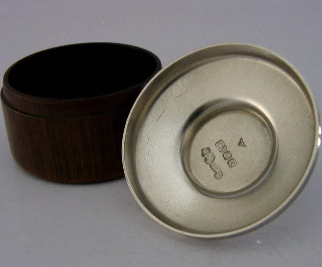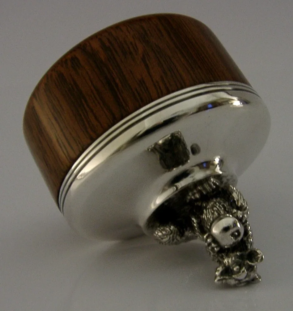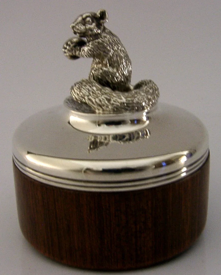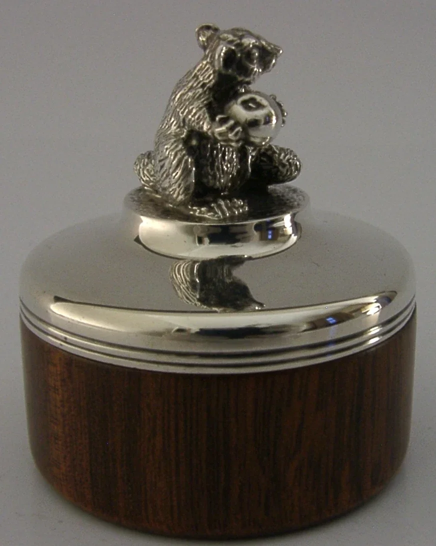 A beautiful hand mad English solid sterling silver trinket box. It is hallmarked for London 1991 with the maker being the designer Brian Leslie Fuller. It has been superbly designed with the lid being decorated with a Dormouse or Glis Glis, the base is wooden. It is in superb condition being free from dings splits and repairs. It measures over 2 inches (5.3cms) wide by 2.5 inches tall and weighs 66 grams (the id alone 45 grams) a super quality piece.
