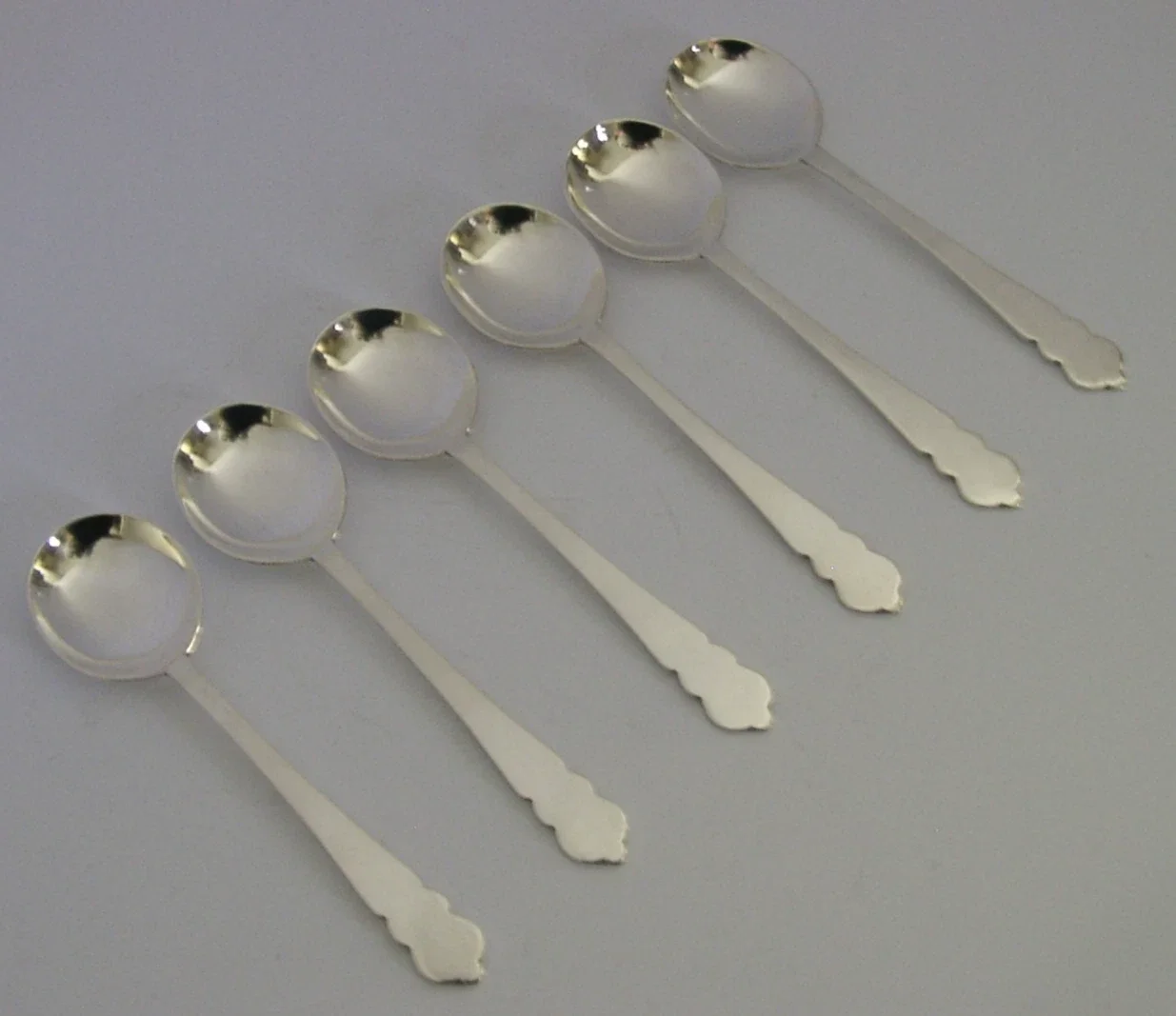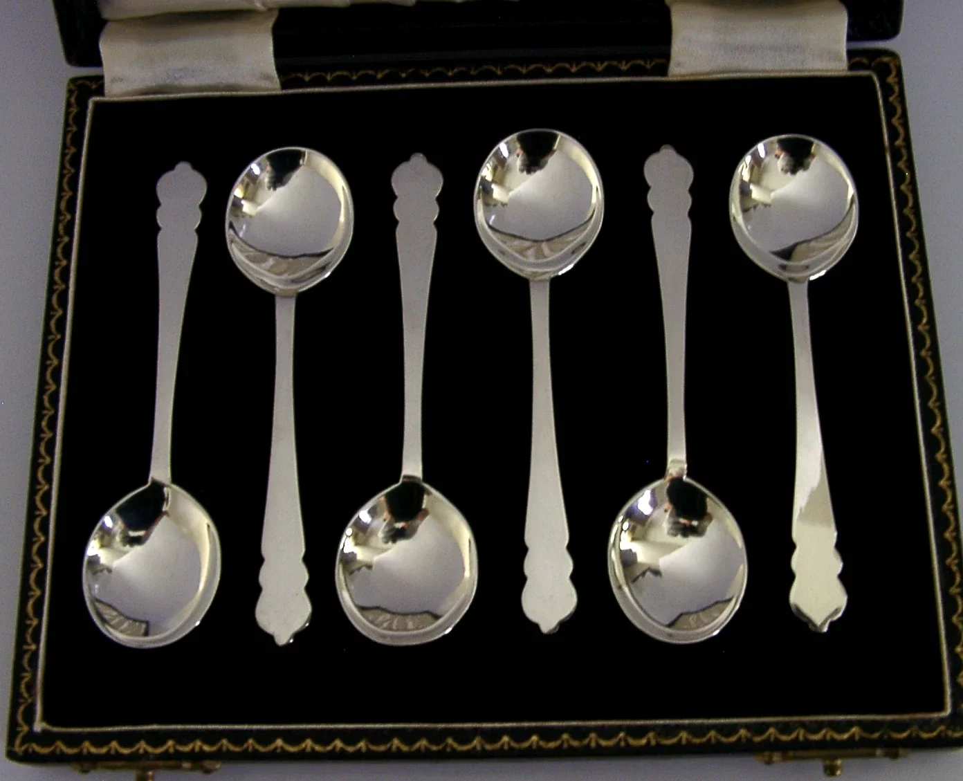 A beautiful stylish set of six cased solid sterling silver Art Deco spoons. They are hallmarked for Birmingham 1956 with the maker being William Suckling Ltd. They have been stylishly designed and are in super condition being free from dings splits and repairs. They measure over 3.5 inches (9.3cm) long by almost 1 inch (2.4cm) wide and have a combined weight of 54 grams excluding the case. A beautifully designed set.