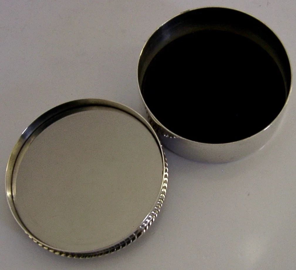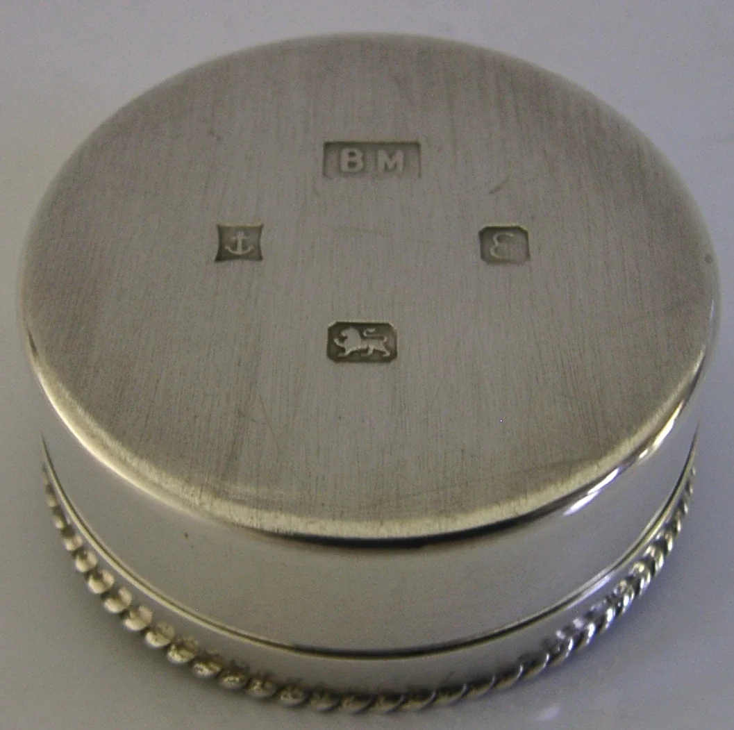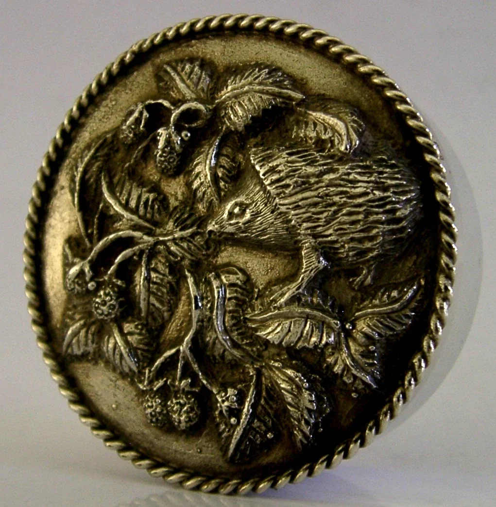 A beautiful English solid sterling silver trinket box. It is hallmarked for Birmingham 1979 with the maker being The Birmingham Mint. It has been superbly designed with the lid being decorated with a hedgehog amongst brambles. It is in superb condition being free from dings splits and repairs, the internal mirror is in very good condition. It measures approx. 2 inches (5.1cm) across by 0.75 inch (1.9cm) tall and weighs 39 grams. A very nicely made piece.