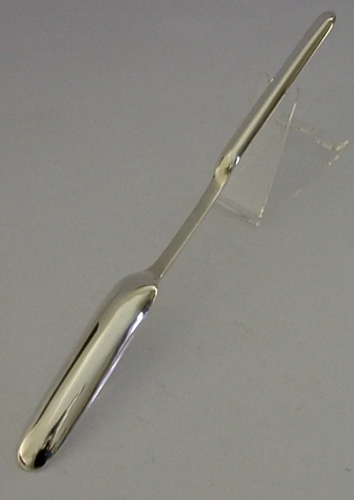 A quality cased solid sterling silver marrow scoop (now more generally used as a cocktail stirrer / mixed). It is hallmarked for Sheffield 1972 with the maker being Cooper Brothers & Sons Ltd. It has been superbly designed and is in super condition having no dings splits distortions or repairs. The scoop measures approx. 9.5 inches (24cm) long by over 0.75 inch (2cm) wide and weighs 48 grams, excluding the case. A quality piece.