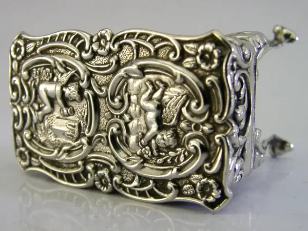 A beautiful English solid sterling silver box. It is hallmarked for Birmingham 1987 the maker being Hampton Utilities. It has been beautifully made being in the form of a table and decorated with cherubs. It is in super condition being free from dings splits holes and repairs, the inside is clean and gilded. It measures approx. 1.75 inches (4.6cm) long by over 1 inch (2.8cm) wide by over 1.5 inches (3.9cm) tall and weigh 30 grams. A very nice quality example.