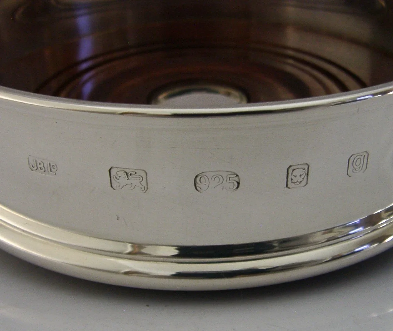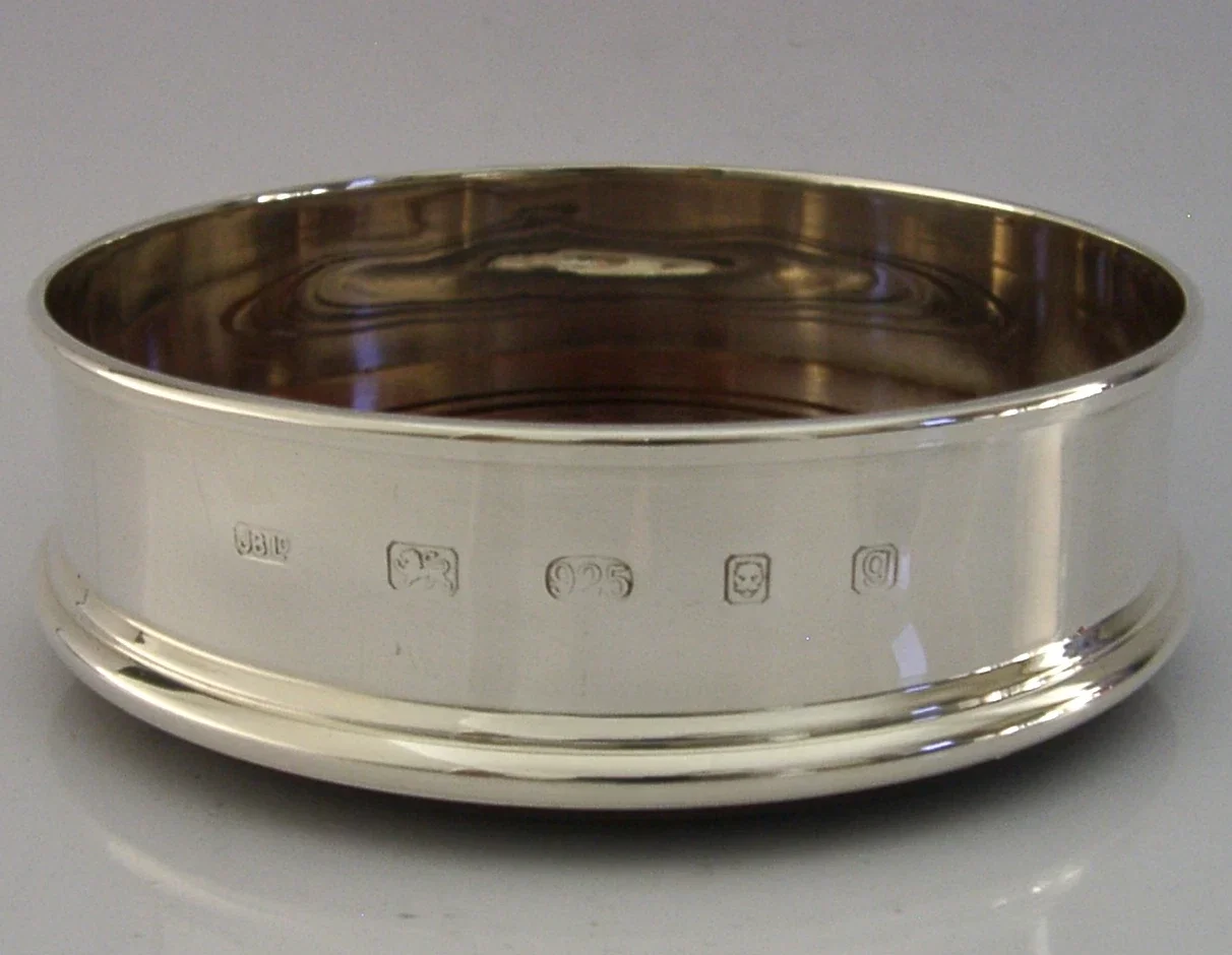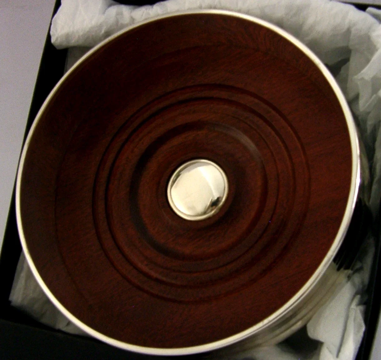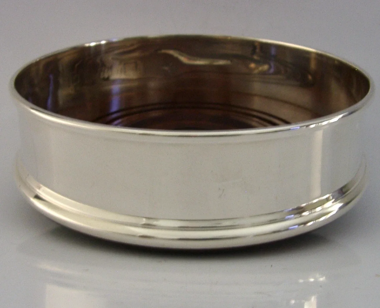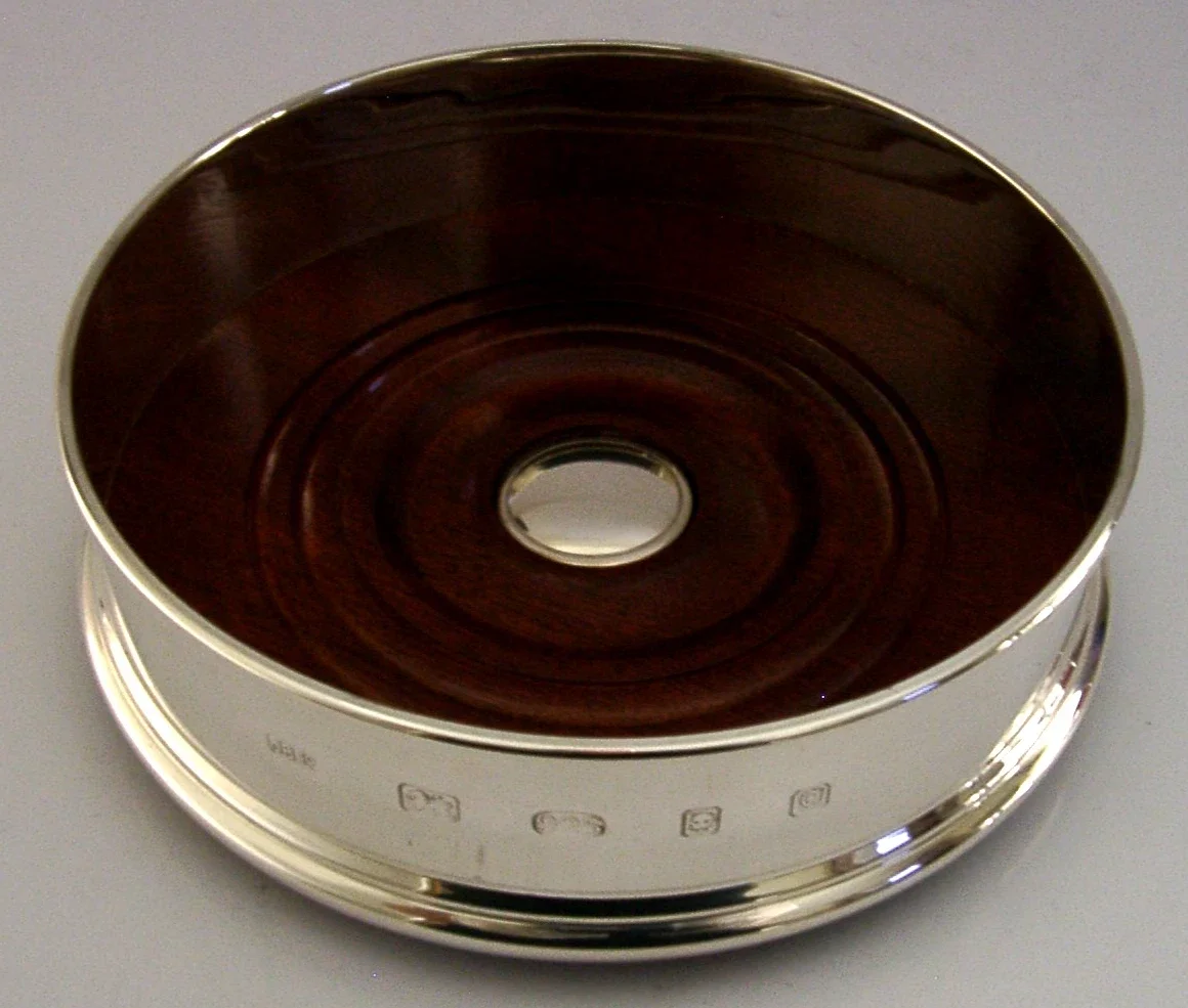 A super quality large English solid sterling silver boxed wine or campaign bottle coaster. It is hallmarked for London 2006 with the maker being John Bull Ltd. It has been superbly made and is in super condition being free from dings splits and repairs. It measures approx. 5 inches (12.8cm) across by almost 1.75 inches (4.2cm) tall and weighs 164 grams (excluding the box). A very nice quality piece.