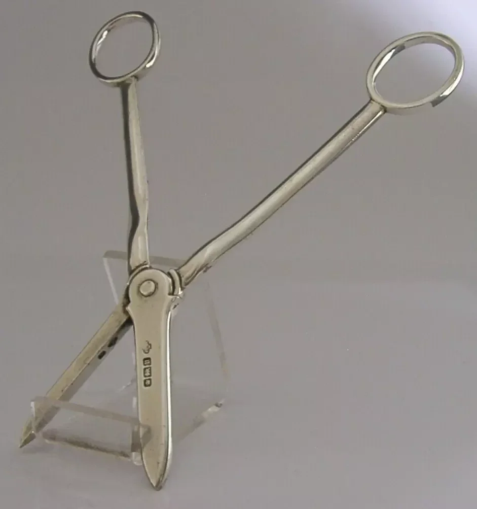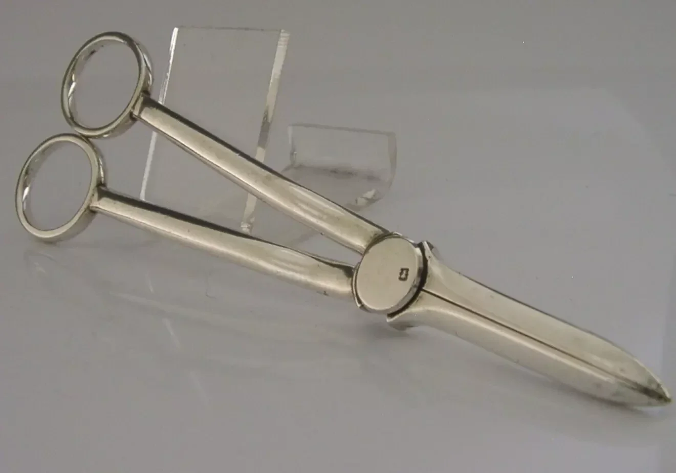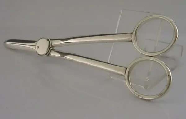Very high quality English antique solid sterling silver grape shears. They are hallmarked for Sheffield 1912 with the maker’s marks being that of William Hutton & Sons. They have been superbly made and are in superb condition being free from dings splits distortions and repairs. They measure approx. 6.25 inches (16cm) long by 2 inches (5cm) wide at the handles and weigh 70 grams. Superbly made very high quality examples.