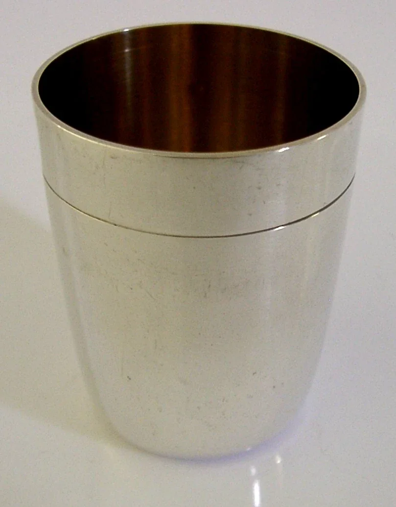 A stylish German solid sterling silver shot cup. It is hallmarked with the 925 standard mark along with the makers mark of Ludwig Neresheimer. I would date it to c1950s. It has been well made and is in superb condition being free from dings splits distortions and repairs. It measures approx. 1.75 inches (4.5cm) tall by 1.5 inches (3.8cm) across the rim and weighs 26 grams. A nice quality piece.