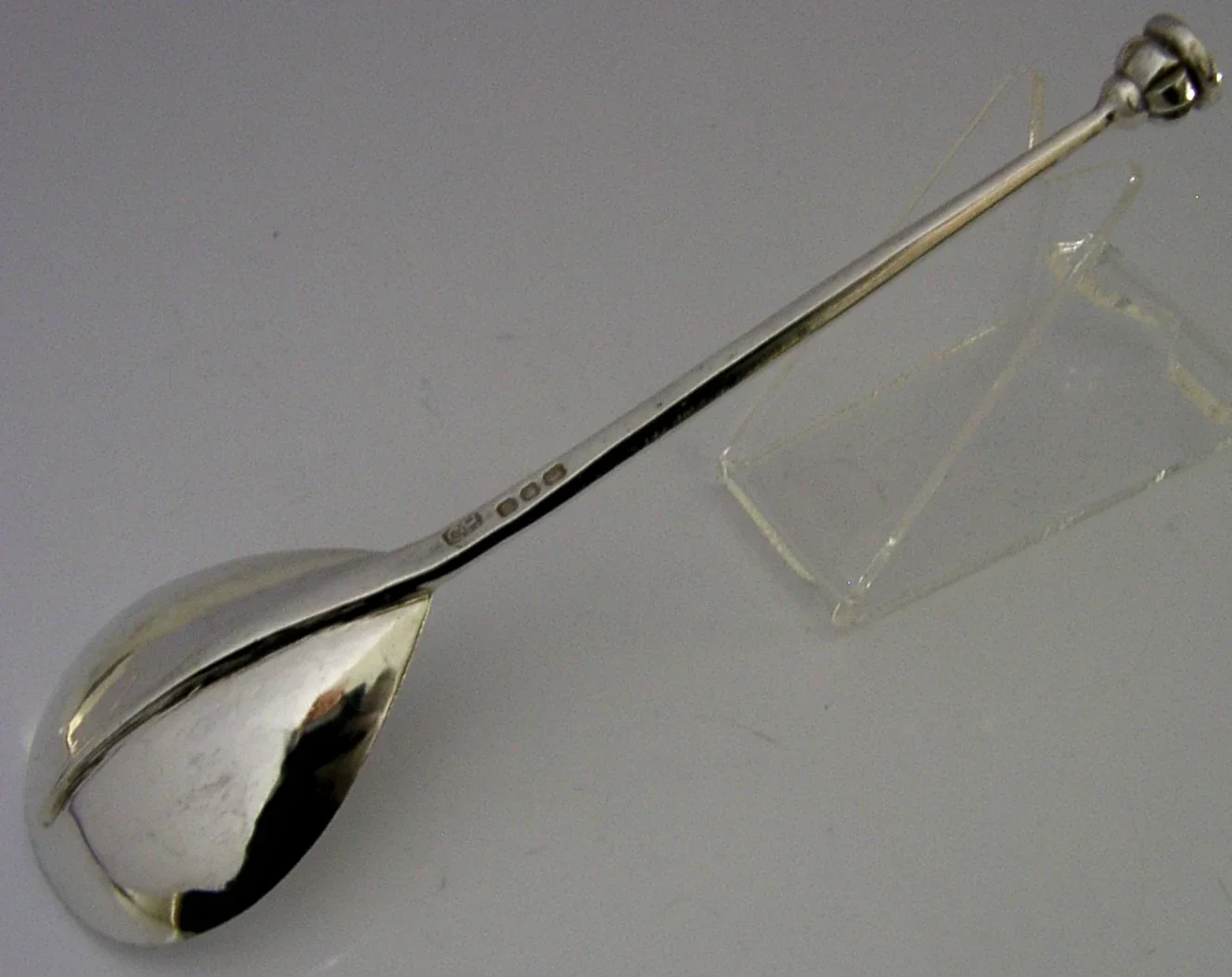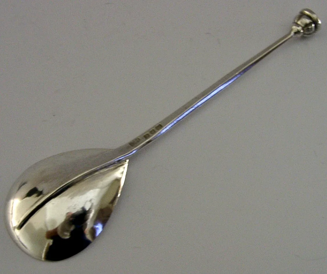 A superb hand made English solid sterling silver spoon. It is hallmarked for London 1969 with the maker being The Guild of Handicrafts. It has been superbly designed being hand plannished in the form of a spoon from the 1600's and is in superb condition being free from dings splits and repairs. It measures approx. 6 inches (15.1cm) long by 1.5 inches (4.1cm) wide across the bowl and weighs 44 grams. A beautifully made example.