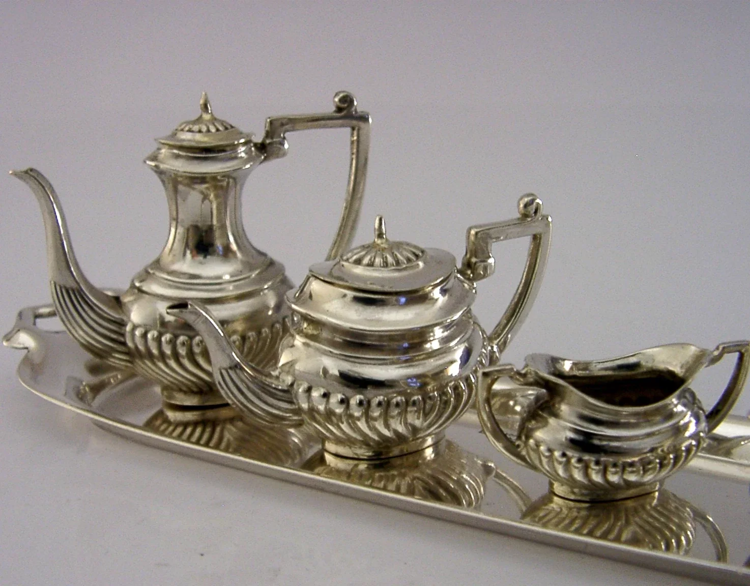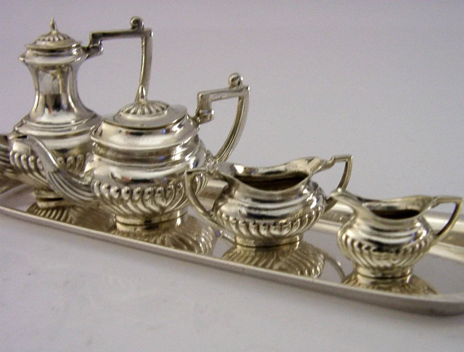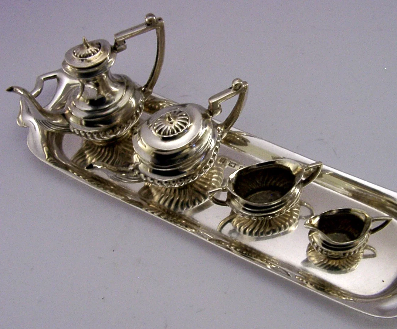 NOVELTY ENGLISH SOLID STERLING SILVER MINIATURE DOLLS HOUSE TEA SET 1951