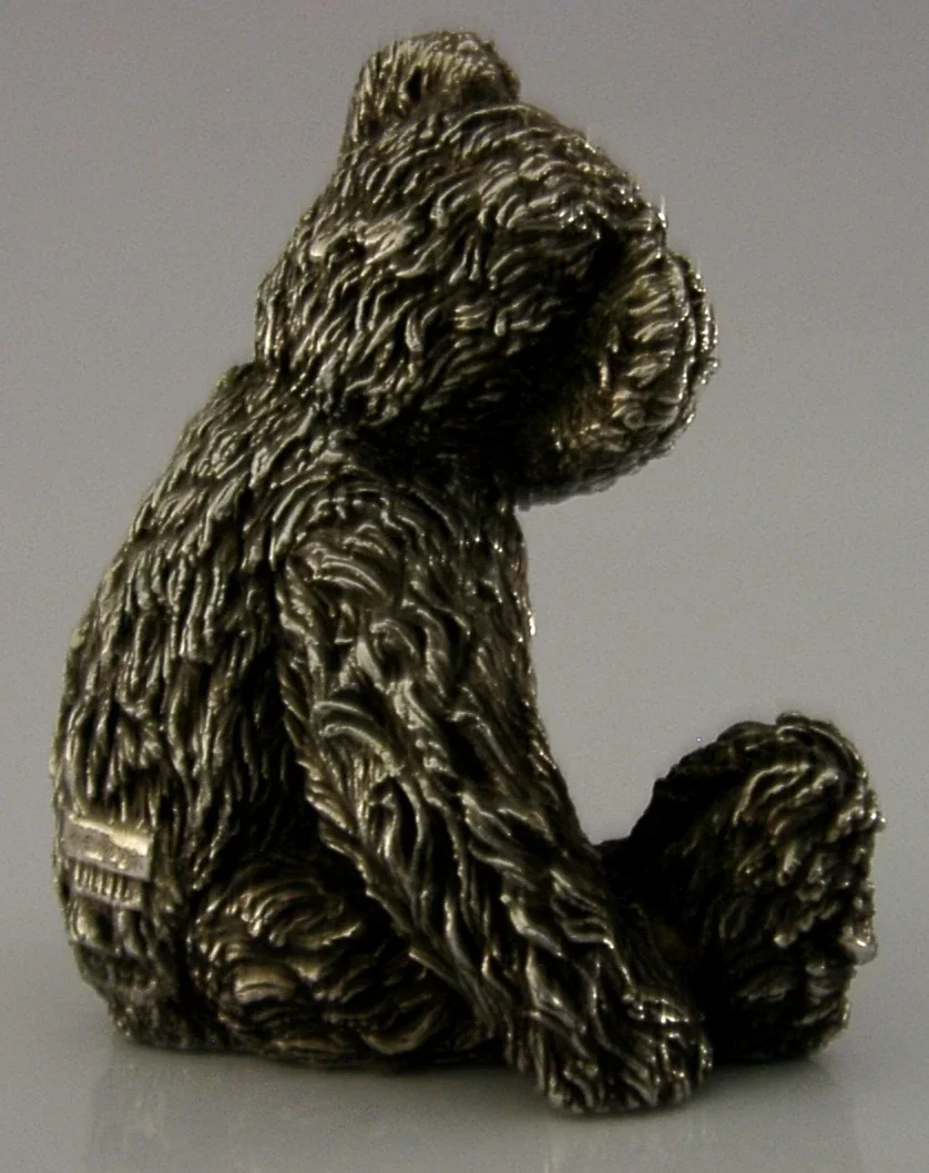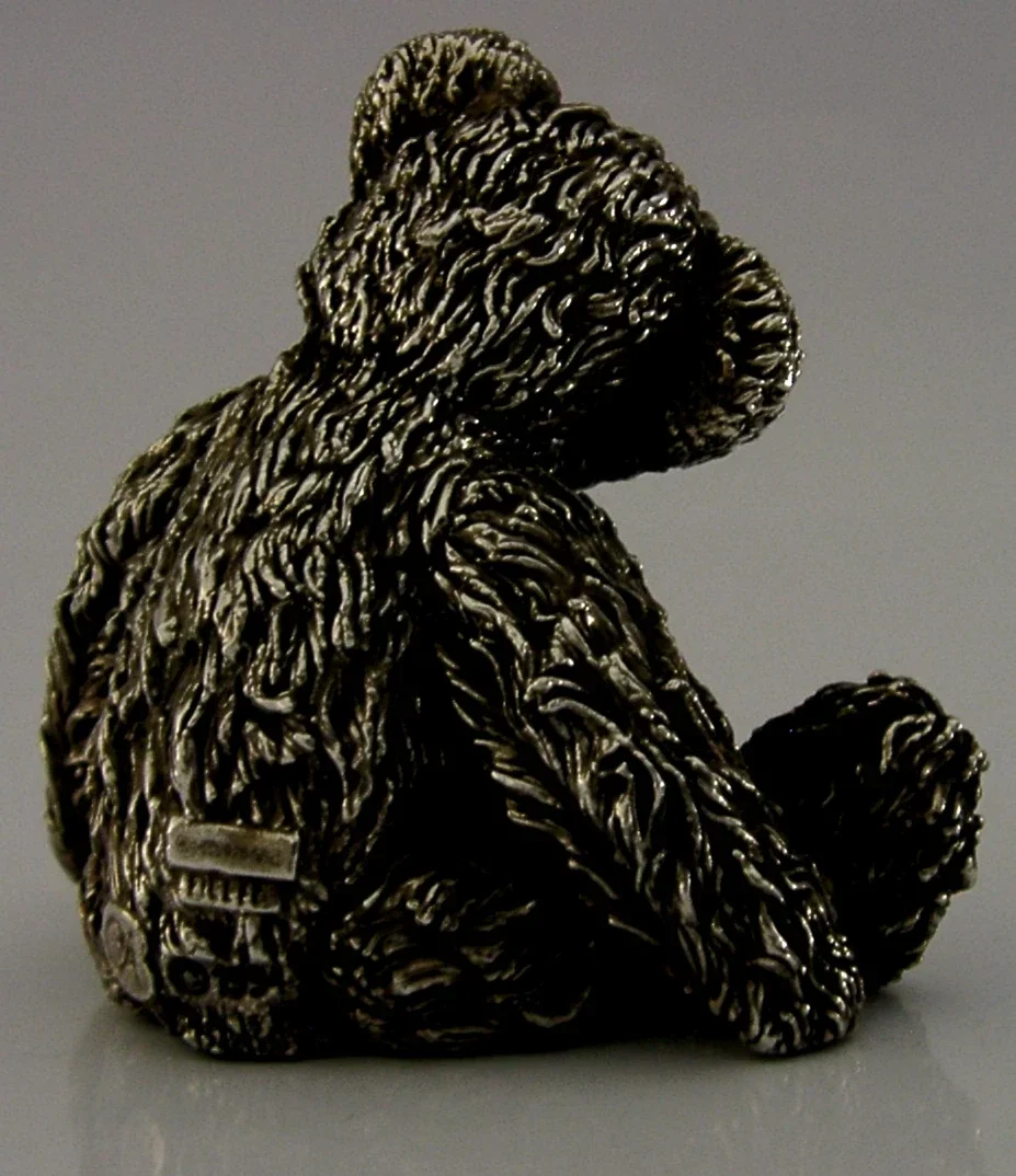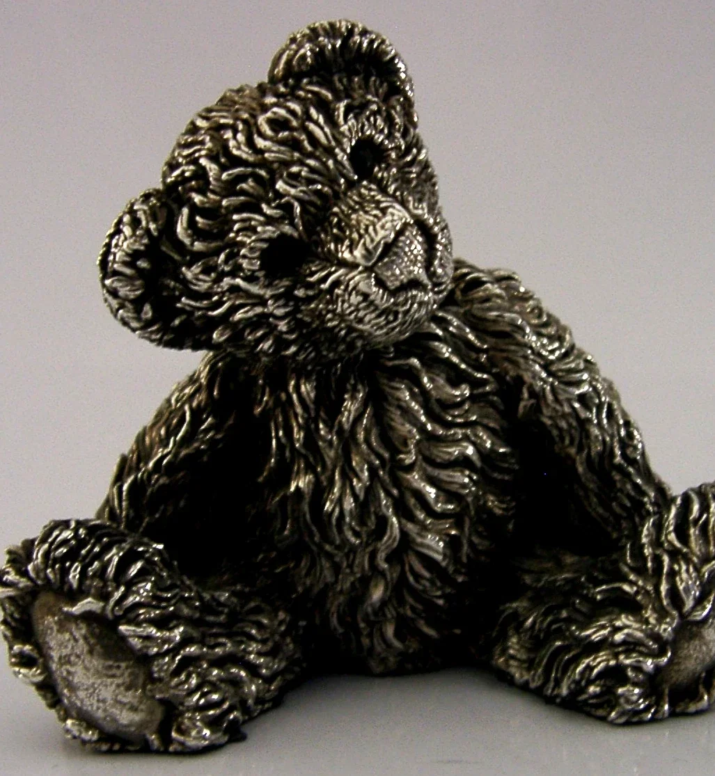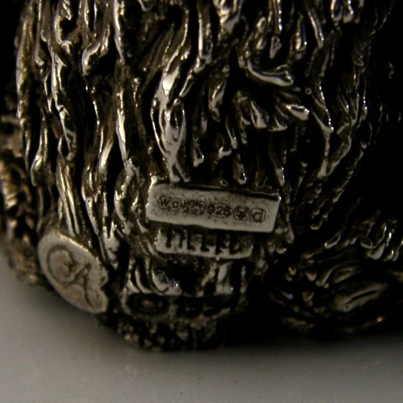 A super quality good sized English sterling silver animal. It is hallmarked for London 2003 with the maker being Comyns of London Ltd. It has been superbly designed being in the form of a teddy bear. It is in superb condition being free from dings splits holes and repairs. It measures approx. 3 inches (7.6cm) tall by 2.75 inches (7cm) across and weighs 114 grams (it will be resin filled). A nice quality piece.
