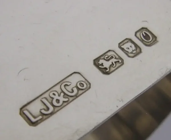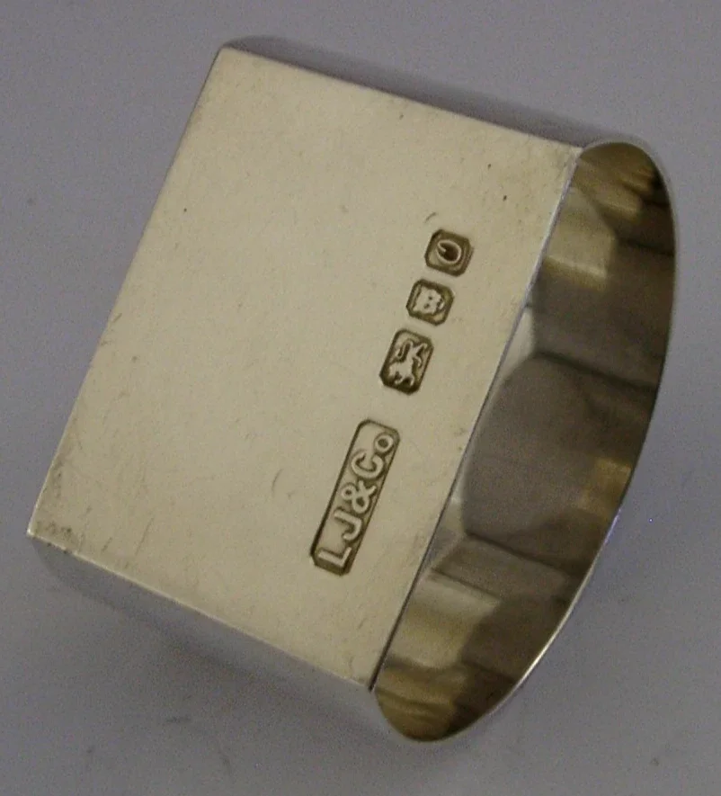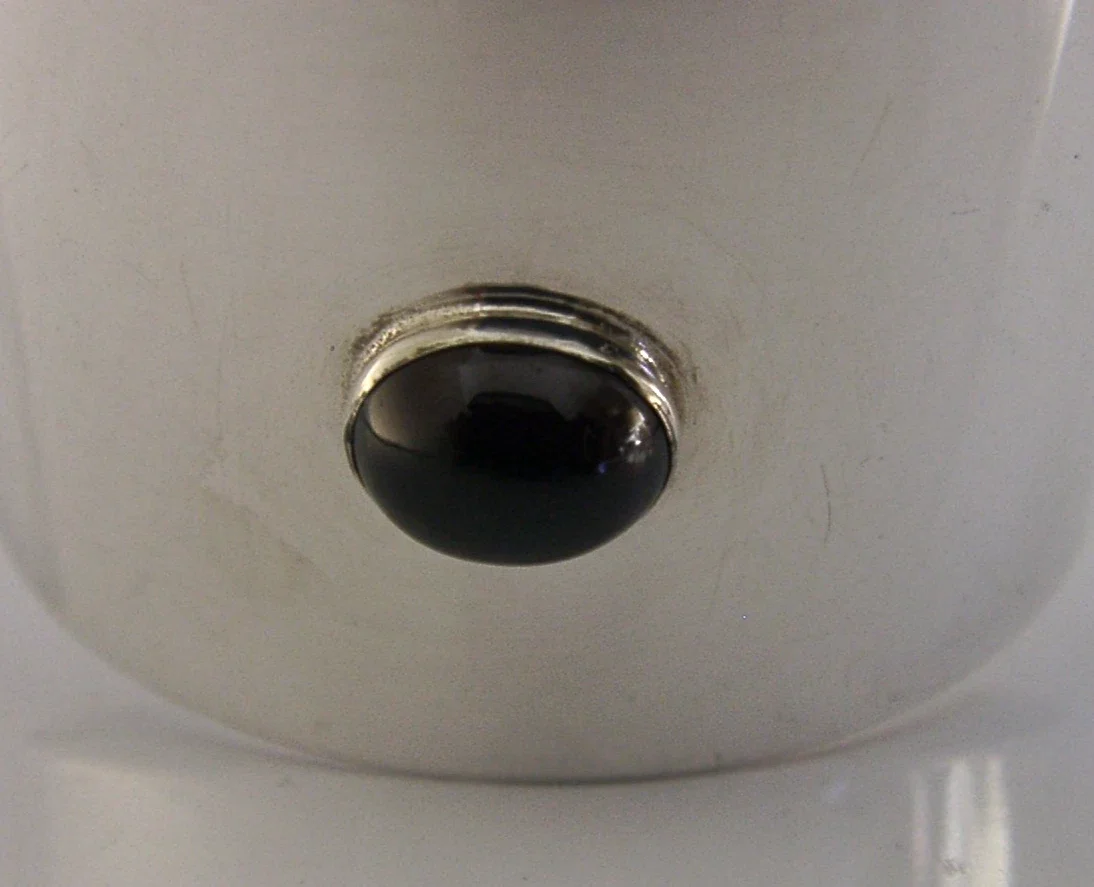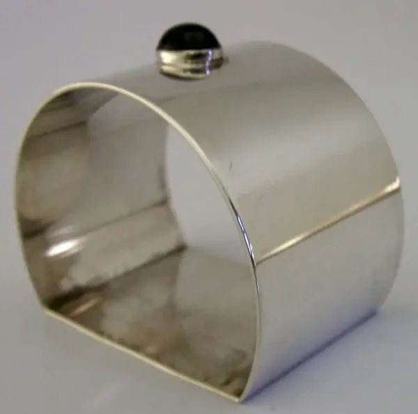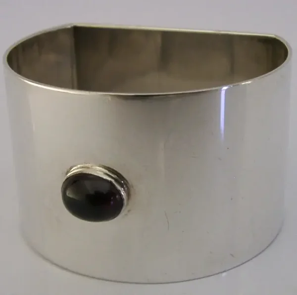 A beautiful arts and crafts style solid sterling silver and gem stone napkin ring. It is hallmarked for London 1988 with the maker being LJ&Co. It has been superbly made being of D shaped form and set with a deep red gem stone. It is in super condition being free from dings splits distortions and repairs. It measures approx. 2 inches (5.1cm) across by over 1.25 inches (3.4cm) wide by 1.5 inches (4cm) tall and weighs 40 grams. A very nice quality piece.