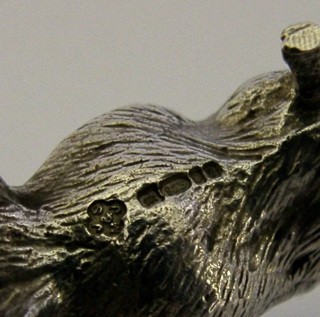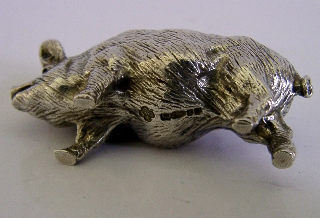 A super quality English solid sterling silver animal. It is hallmarked for London 1999 with the makers marks being JS&MJ. It has been superbly designed being cast in the form of a pig. It is in superb condition being free from dings splits holes and repairs. It measures approx. 2 inches (4.8cm) long by 1 inch tall and weighs 66 grams. A very nice quality example.