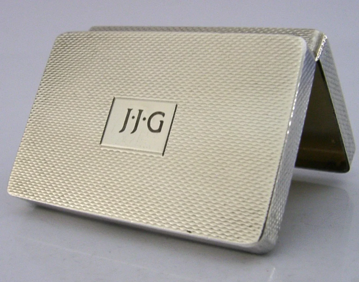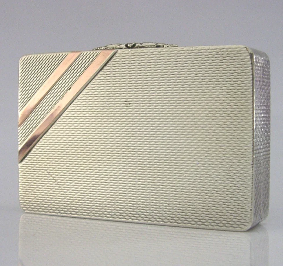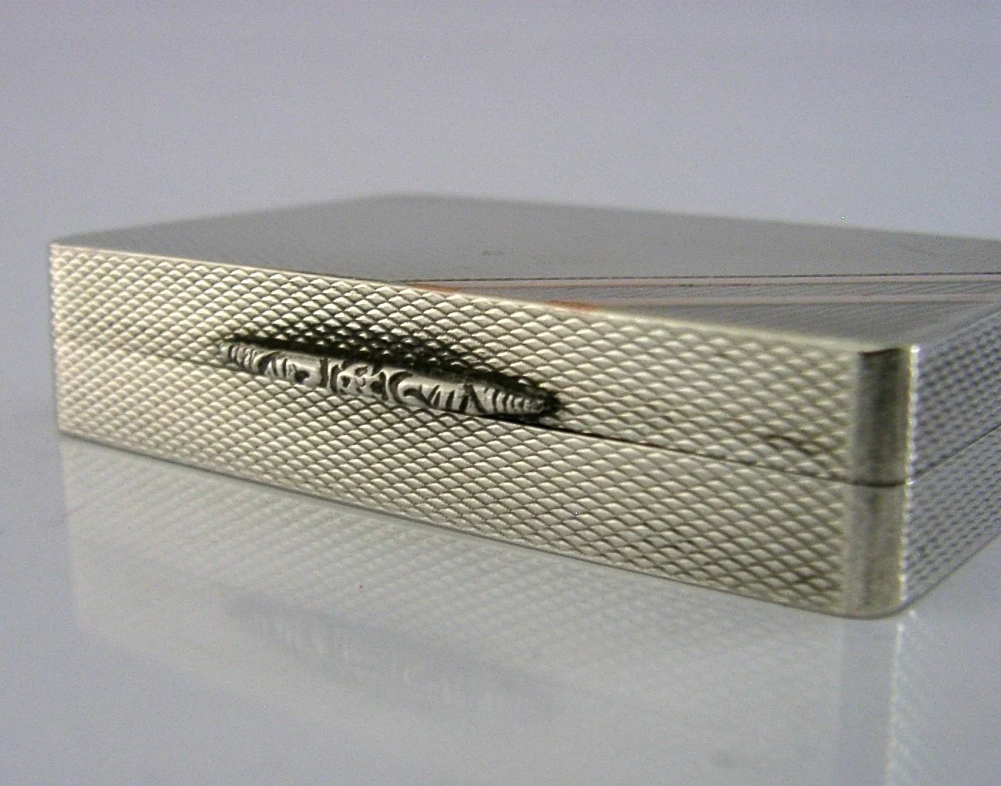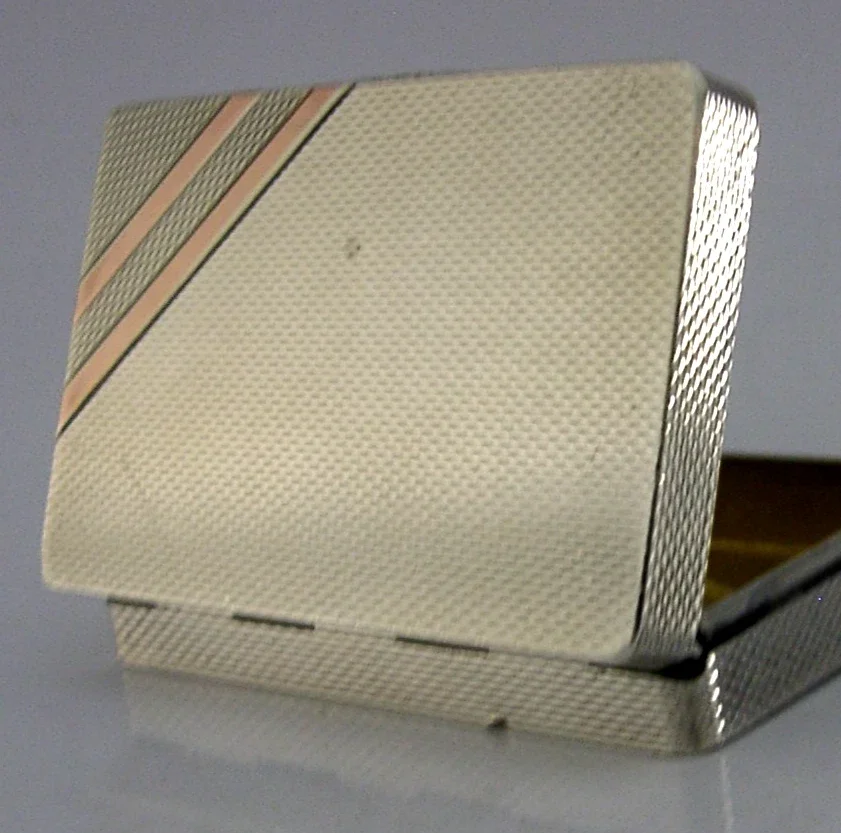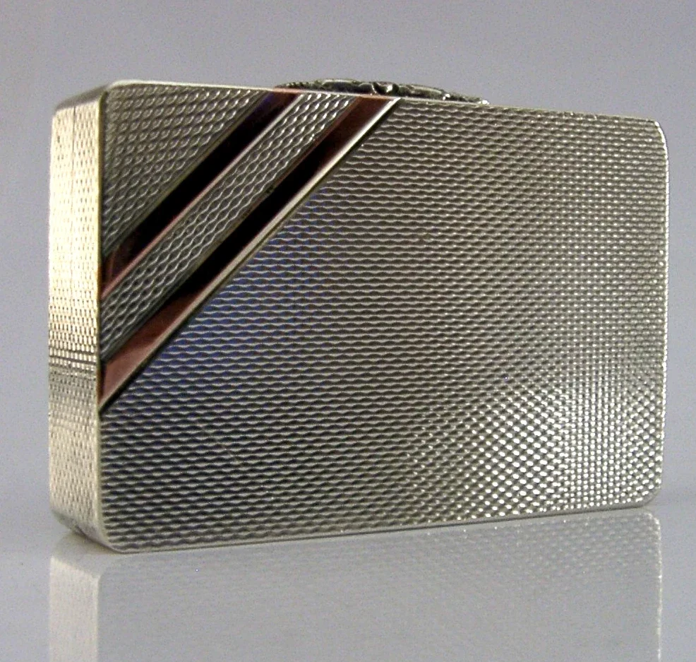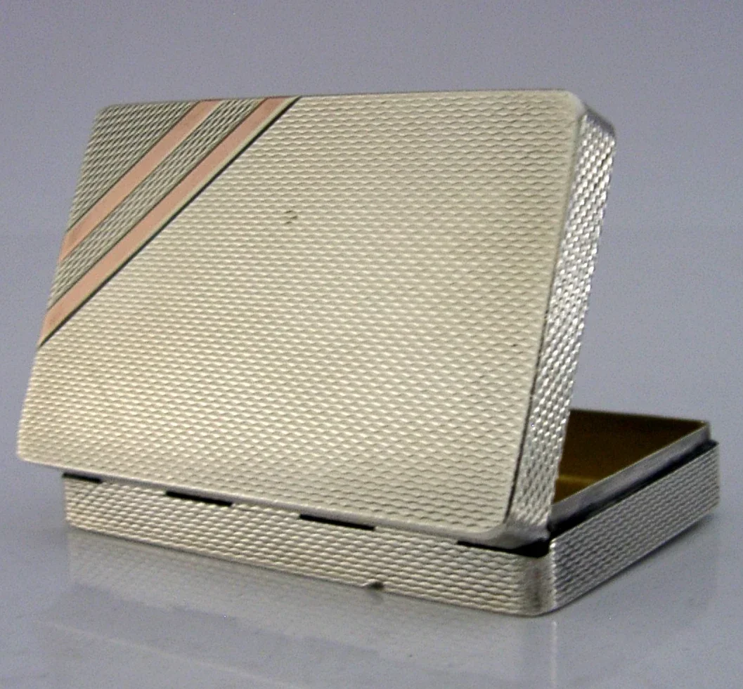 A super quality solid sterling silver box. It is hallmarked for London 2003 with the maker being PJD for Peter John Doherty, made for Gallagher's who had links to Aspreys and Garrards. It has a stylish engine turned design and has two rose gold bands to the lid. It is in super condition being free from dings splits distortions and repairs, a tiny mark to the back base edge. The hinge is smooth and tight. The JJG (J J Gallagher) logo is on the base. It measures over 2.5 inches (6.7cm) across by 1.75 inches (4.2cm) wide by over 0.5 inch (1.4cm) tall and weighs 82 grams. A very high quality example.