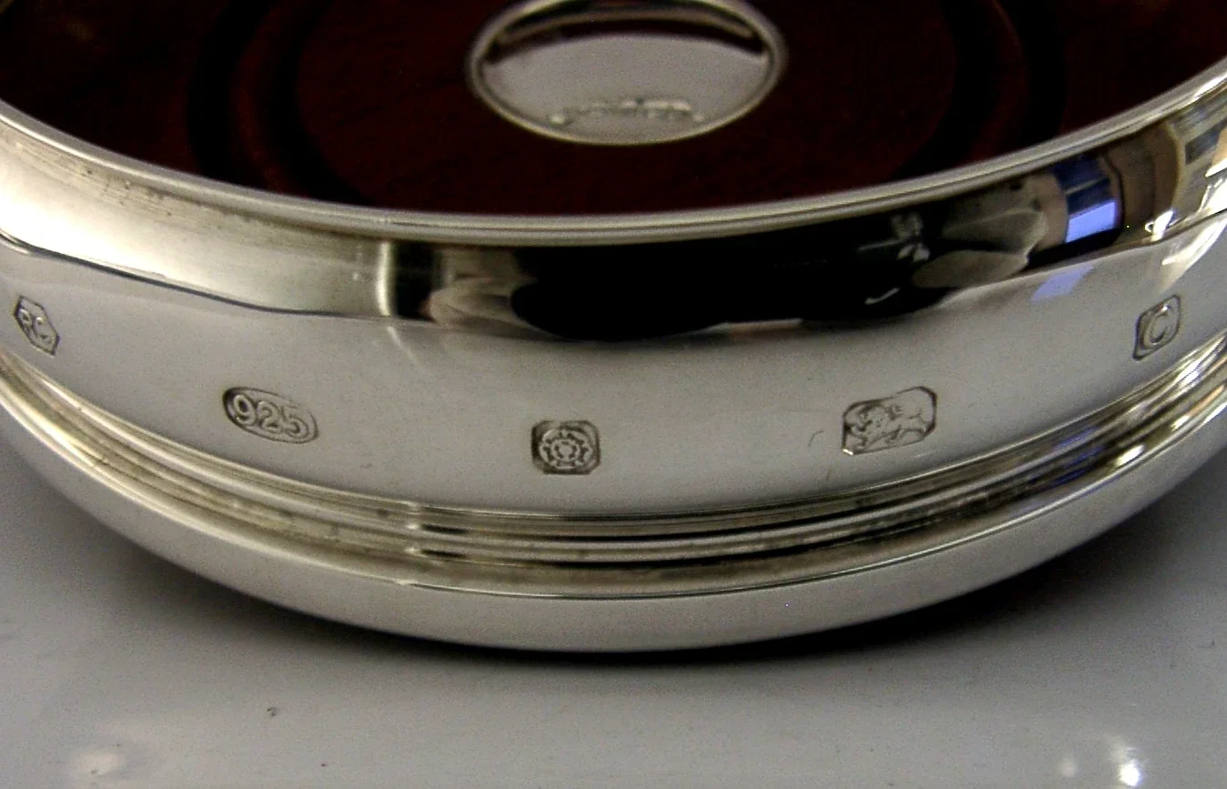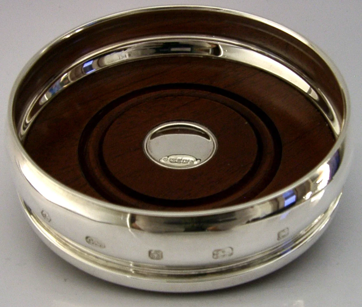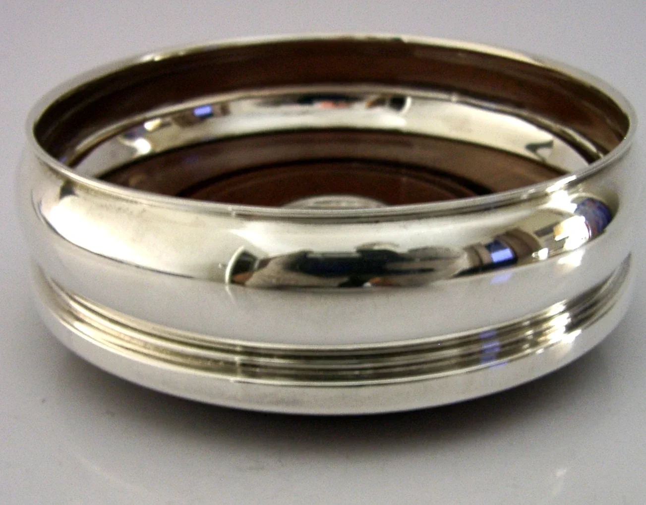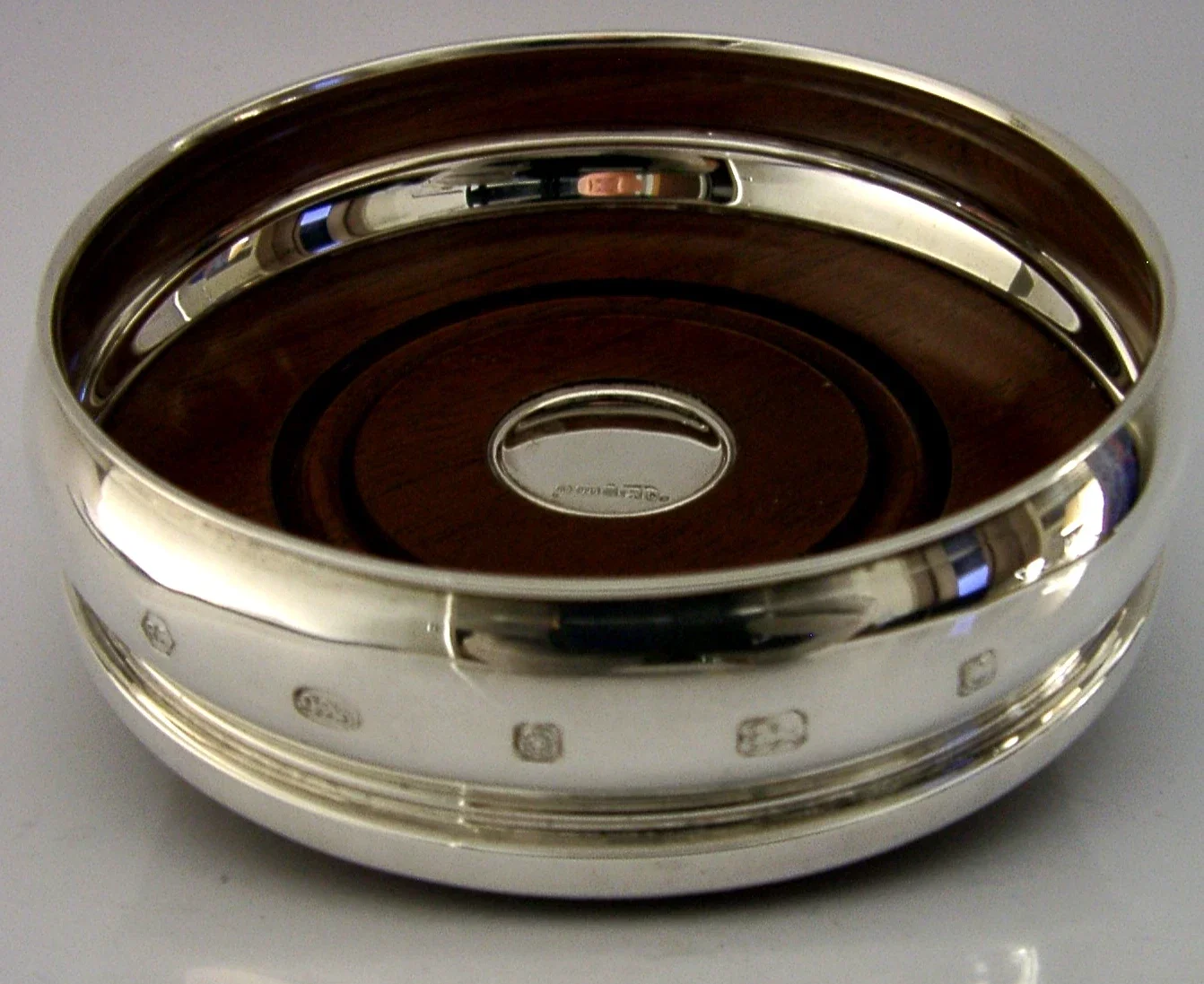 A super quality English solid sterling silver wine bottle coaster. It is hallmarked for London 2002 with the maker being Carr's of Sheffield Ltd. It has been superbly made and is in super condition being free from dings splits and repairs. It measures approx. 4 inches (10cm) across by almost 1.5 inches (3.6cm) tall and weighs 88 grams. A very nice quality piece.