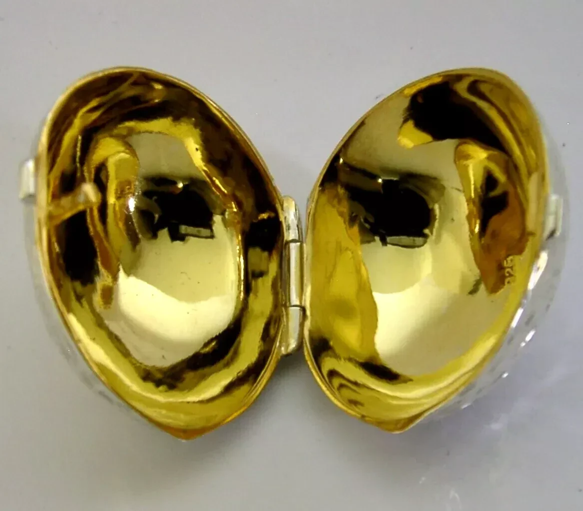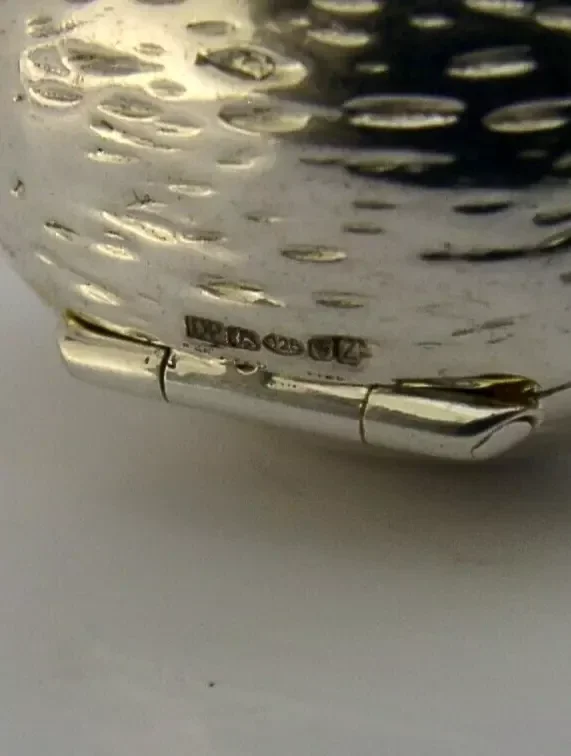 A very unusual English solid sterling silver novelty box. It is hallmarked for London 2024 with the makers marks being DP. It has been superbly designed being cast in the form of a nut possibly a pecan or walnut. It is in super condition being free from dings splits holes and repairs, the inside is clean and gilded, the lid closes tightly. It measures approx. 1.5 inches (3.6cm) by 1.25 inches wide and weighs 24 grams. A super fun piece.