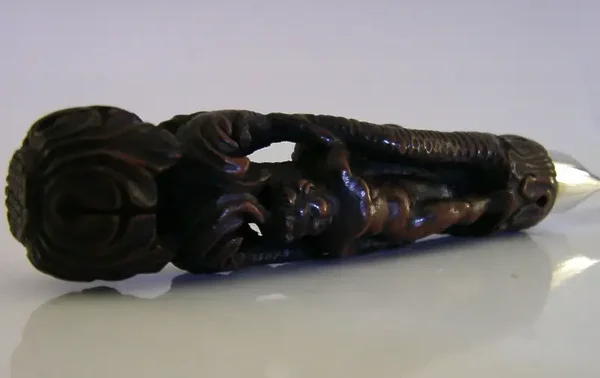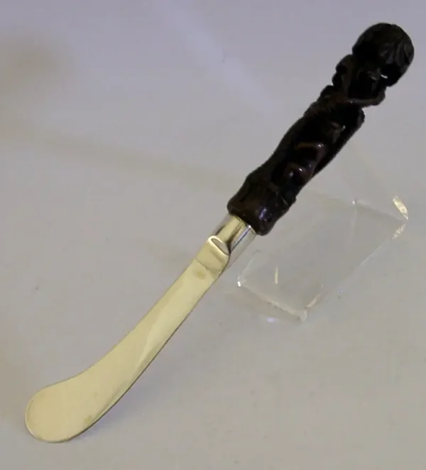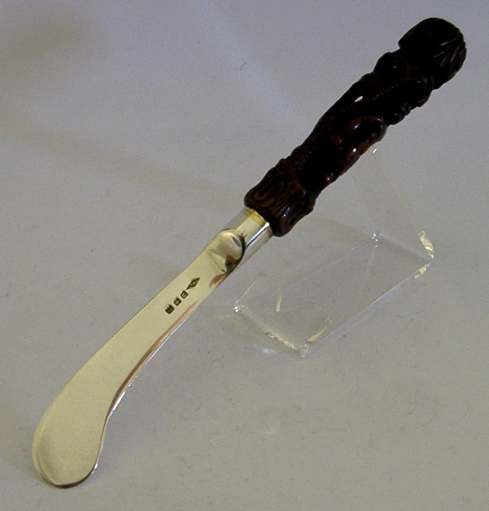 A very rare English antique solid sterling silver and carved wooden handle butter spreader. The silver is hallmarked for London 1928 with the maker being Johnson, Walker & Tolhurst. It has been superbly designed having a carved wooden handle - I suspect this is much earlier by its design / patina possibly late 17th early 18th century. It is in superb condition being free from dings splits and repairs. The whole piece measures approx. 8 inches (20.2cm) long by 1 inch (2.6cm) across the handle and the whole piece weighs 44 grams. A beautifully made rare example.
