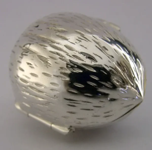 A very unusual English solid sterling silver novelty box. It is hallmarked for London 2024 with the makers marks being DP. It has been superbly designed being cast in the form of a nut possibly a pecan or walnut. It is in super condition being free from dings splits holes and repairs, the inside is clean and gilded, the lid closes tightly. It measures approx. 1.5 inches (3.6cm) by 1.25 inches wide and weighs 22 grams. A super fun piece.