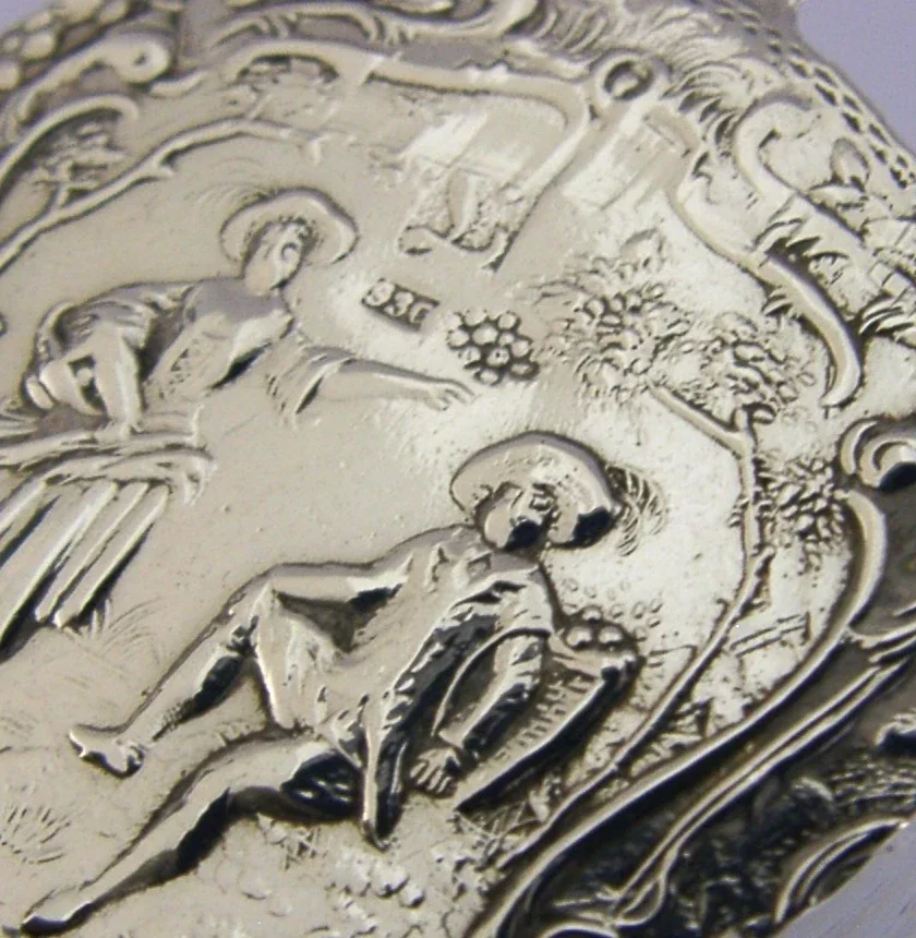 A beautiful German Hanau export solid sterling silver novelty box. It is hallmarked with the German Hanau silver marks along with the English import hallmarks for Sheffield 1896 with the importers mark being Samuel Boyce (or Boaz) Landeck. It has been beautifully made being in the form of bellows which apparently at the time symbolised purity and Gods purification of man. It is in super condition being free from dings splits holes and repairs, the inside is clean and gilded. It measures approx. 3.75 inches (9.5cm) long by 1.75 inches (4.4cm) wide by over 0.5 inch (1.7cm) tall and weighs 30 grams. A very high quality example.