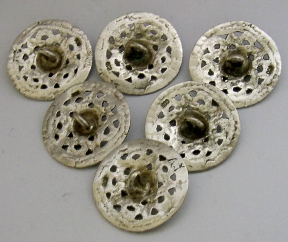 A beautiful set of six good sized English antique solid sterling silver buttons. They are all hallmarked with the 800 silver standard mark and test as such. They have been beautifully made are all in superb condition being free from dings splits holes and repairs. They measure over 1 inch (2.8cm) across and have a combined weight of 24 grams. A super quality set.
