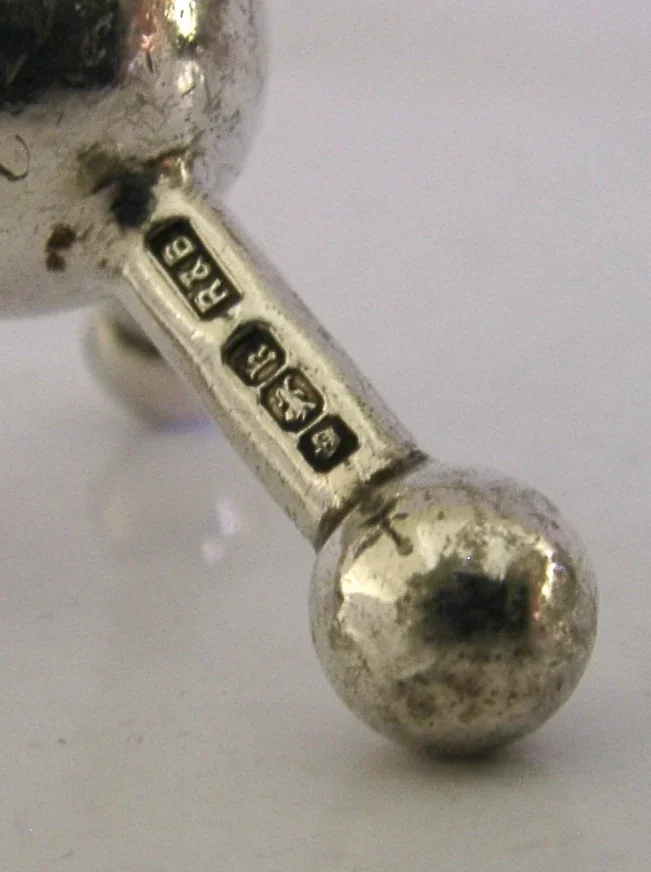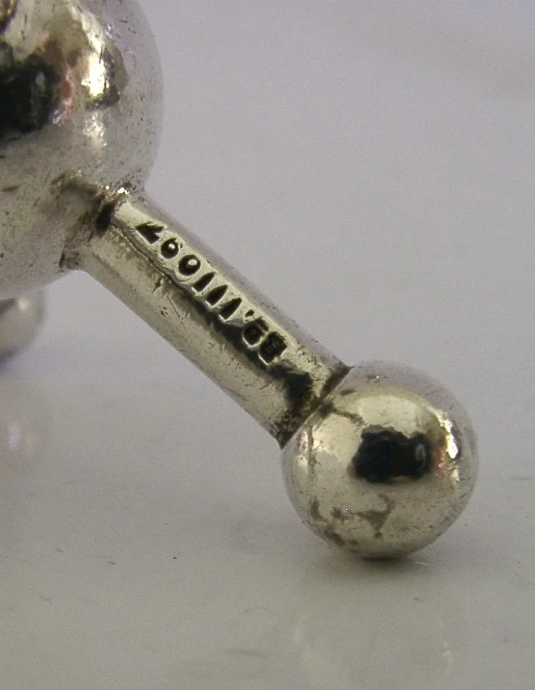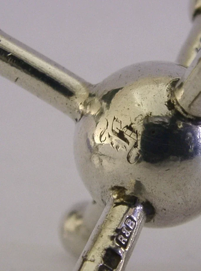 A rare set of Edwardian English antique solid sterling silver cutlery rests. They are hallmarked for Sheffield 1902 with the maker being Roberts & Belk. They have an unusual ball design associated with Christopher Dresser with the registration number being 111097 for the date 1888 (the exact period Dresser was designing). They are in super condition being free from dings splits and repairs, each engraved with a tiny Gothic initial see photo. They measure approx. 2 inches (5cm) across by over 1.5 inches (4.2cm) tall and combined weigh 110 grams. Super quality rare examples especially in sterling silver.