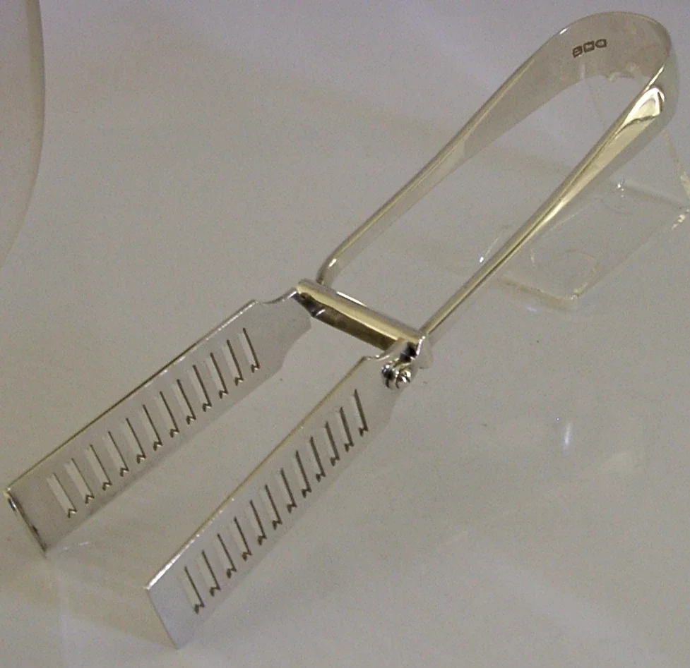 High quality English Edwardian antique solid sterling silver asparagus, vegetable, or sandwich serving tongs. They are hallmarked for London 1903 with the maker being hard to read. They have been engraved with a crest used by the Taylor and Crossman Families. They are highly sprung and in good working order. They are in superb condition being free from dings splits distortions and repairs. They measure approx. 8.5 inches (21.5cm) long by 1 inch wide across the grips and they weigh an impressive 136 grams. Super quality examples.