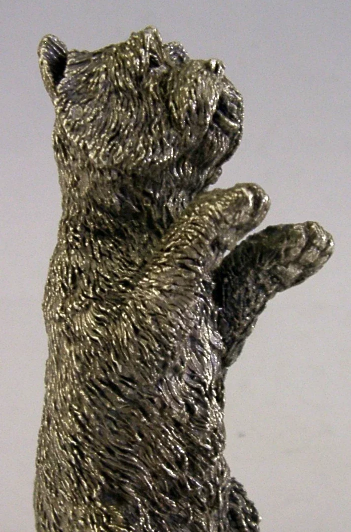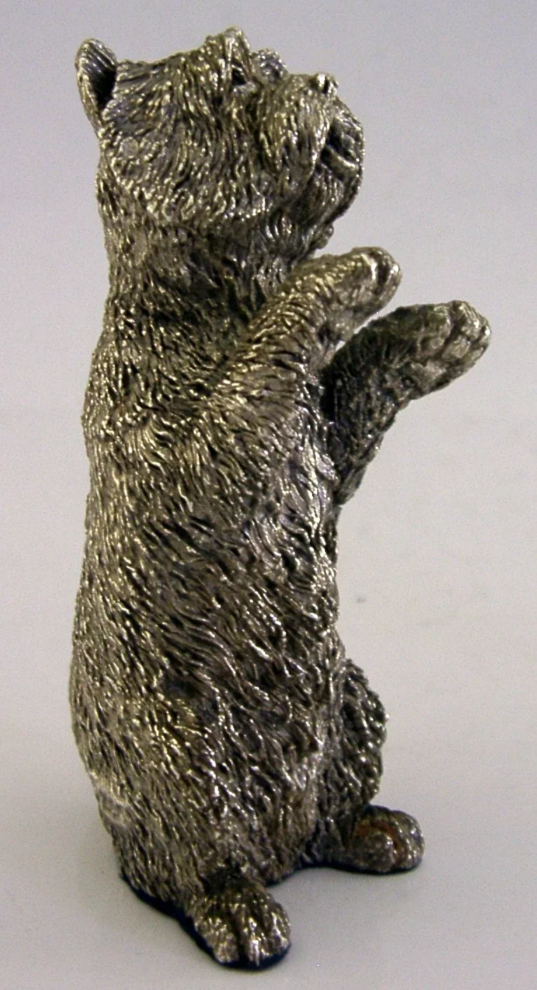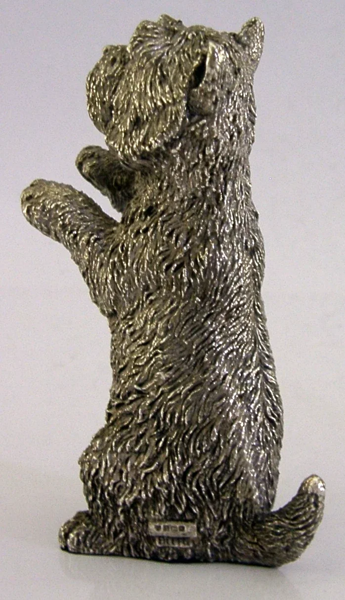 A super quality good sized English sterling silver animal. It is hallmarked for Birmingham 1997 with the maker being Country Artists. It has been superbly designed being in the form of a terrier dog possibly a West highland or Scottish terrier. It is in superb condition being free from dings splits holes and repairs, still boxed. It measures approx. 3.5 inches (9cm) tall by 2 inches (5.1cm) across by 1.25 inches (3.2cm) wide and weighs 104 grams (it will be resin filled). A nice quality piece.