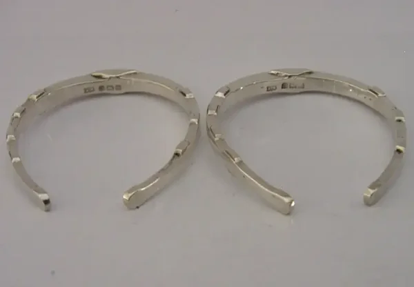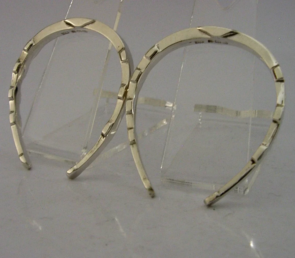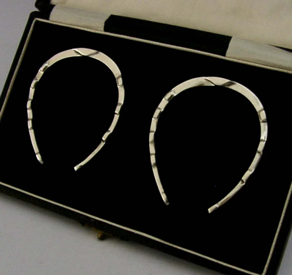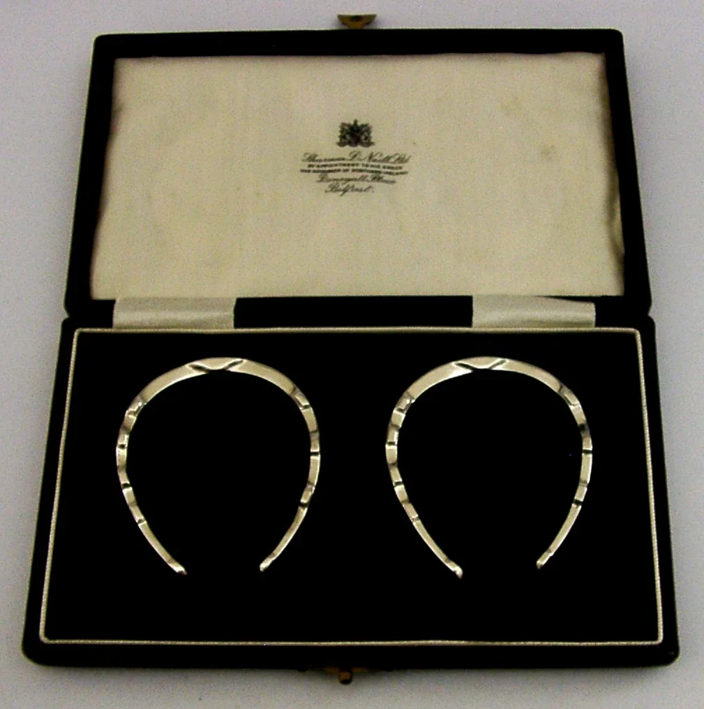 A rare nice clean pair of cased English Art Deco solid sterling silver novelty napkin rings. They are all hallmarked for Birmingham 1933 with the maker being A Wilcox. They have been superbly made being in the form of horse shoes, ideal for a wedding gift. They are in super condition being free from dings splits distortions and repairs. The case is also superb. They measure almost 2 inches (4.8cm) wide by over 2 (5.3cm) across and have a combined weight of 30 grams excluding the case. A very nice clean set.