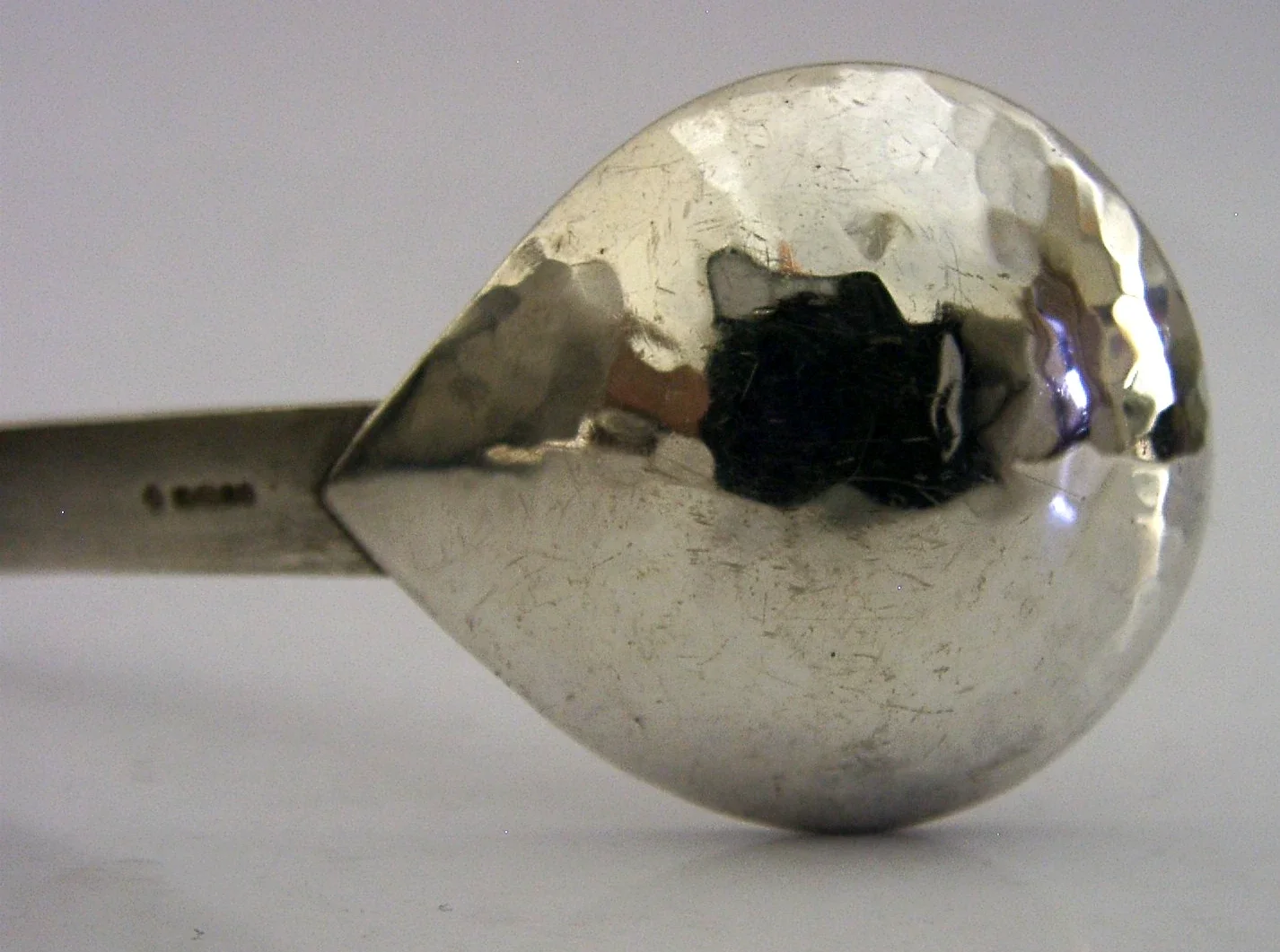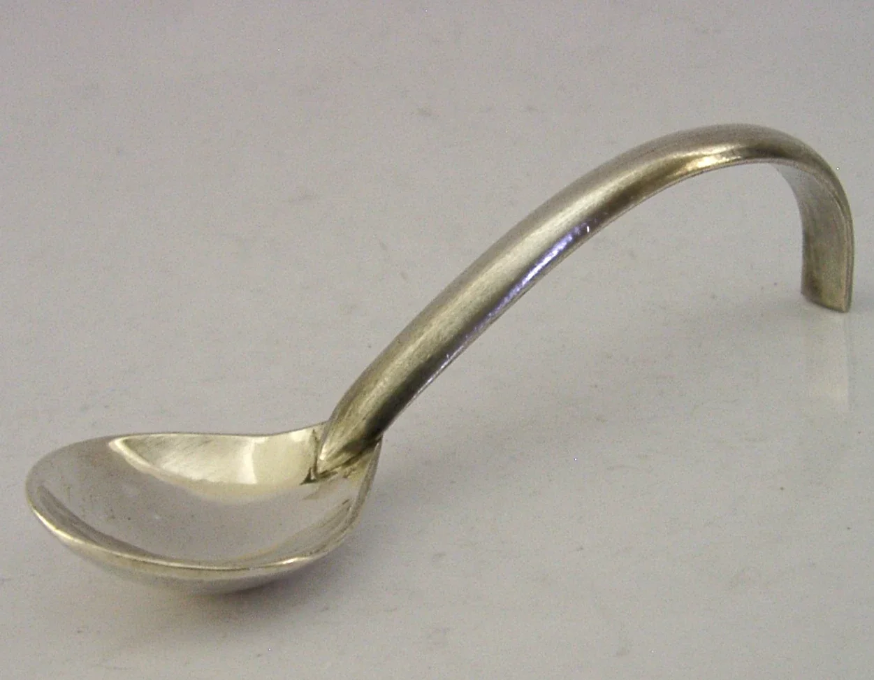 A superbly designed hand made English solid sterling silver caddy spoon. It is hallmarked for London 2005 with the makers mark being KDCH. It has been superbly hand made having an arching handle and plannished bowl back. It is in super condition being free from dings splits distortions and repairs. It measures approx. 4.25 inches (11cm) long and weighs 37 grams. A very nice example.