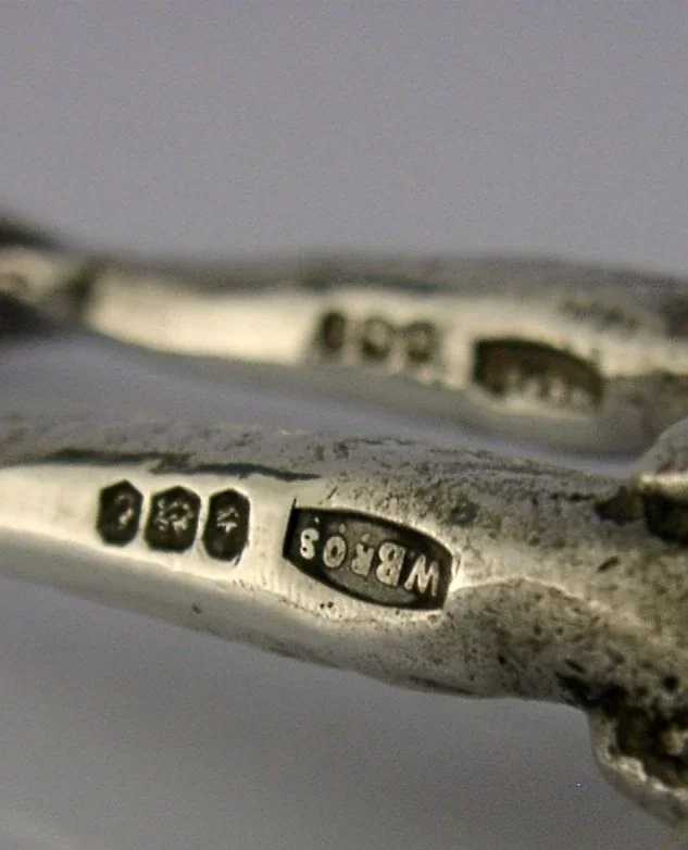 A beautiful designed pair of English novelty solid sterling silver cutlery rests. They are hallmarked for Sheffield 1972 with the maker being W BROS. They have been beautifully designed in the form of dogs and are in superb condition being free from dings splits and repairs. They measure approx. 3.25 inches (8cms) long by 1.25 inches tall and have a combined weight of 70 grams. Very good quality beautiful examples.