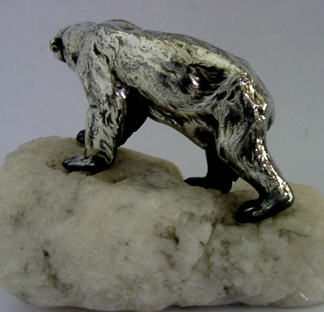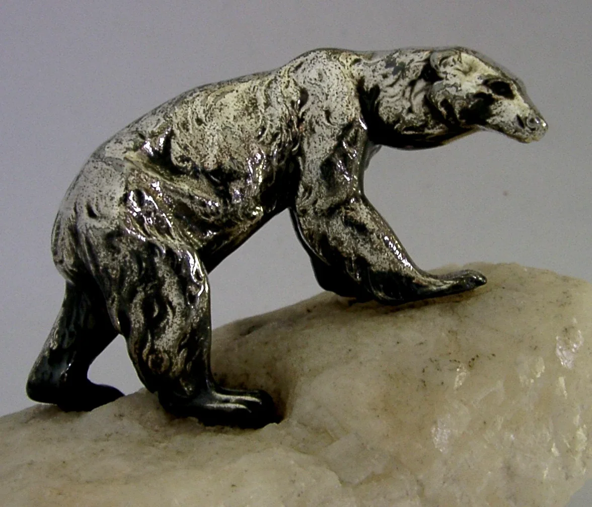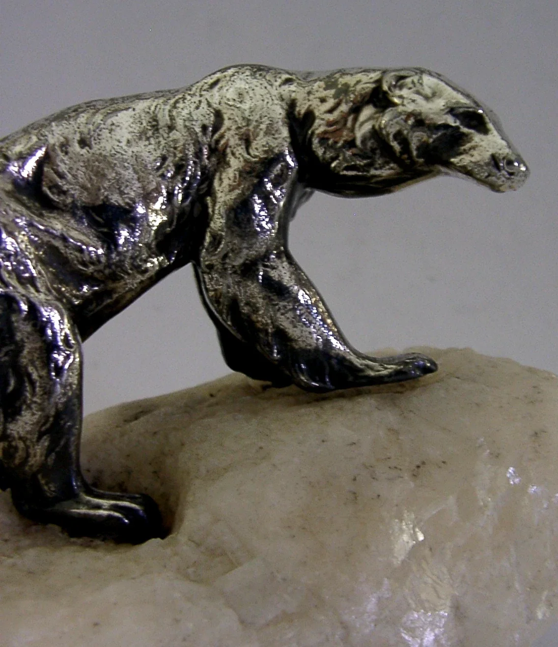 A superbly modelled silver plated animal figure. It is unmarked but dates to c1910 almost certainly German or Austrian - maybe WMF or similar. It has been superbly modelled being in the form of a polar bear mounted on white crystal quartz so it looks like ice. It is in superb condition being free from dings splits and repairs. All the silver plate is original and complete. It measures approx. 4.5 inches (11.3cm) long at the base by 3.75 inches tall and weighs 810 grams. A very well designed high quality piece.