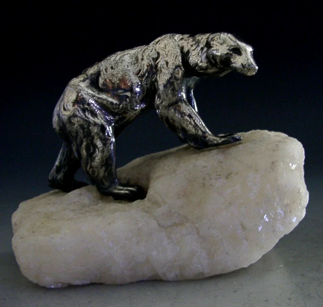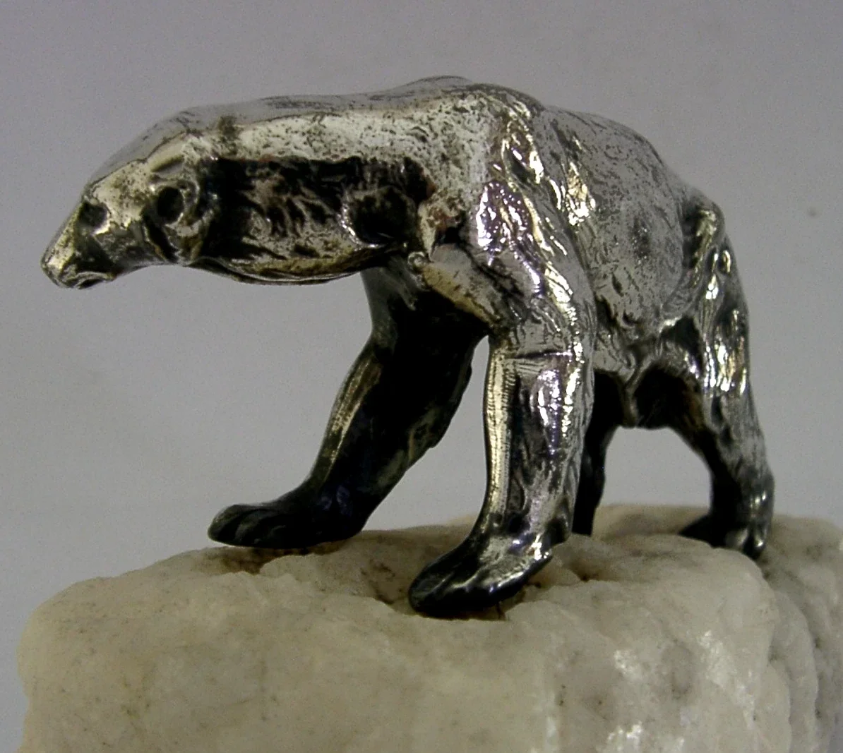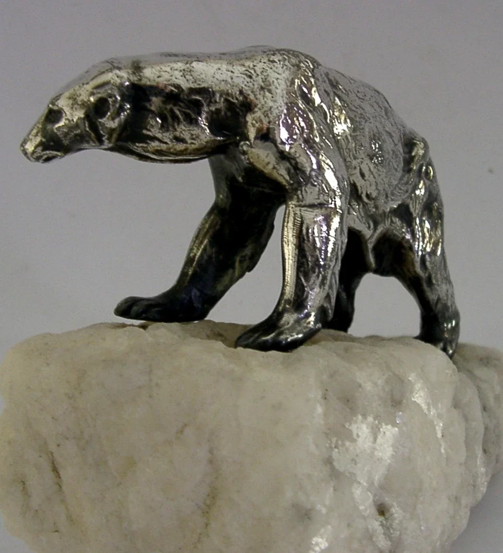 A superbly modelled silver plated animal figure. It is unmarked but dates to c1910 almost certainly German or Austrian - maybe WMF or similar. It has been superbly modelled being in the form of a polar bear mounted on white crystal quartz so it looks like ice. It is in superb condition being free from dings splits and repairs. All the silver plate is original and complete. It measures approx. 4.5 inches (11.3cm) long at the base by 3.75 inches tall and weighs 810 grams. A very well designed high quality piece.