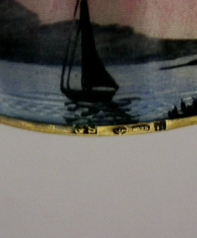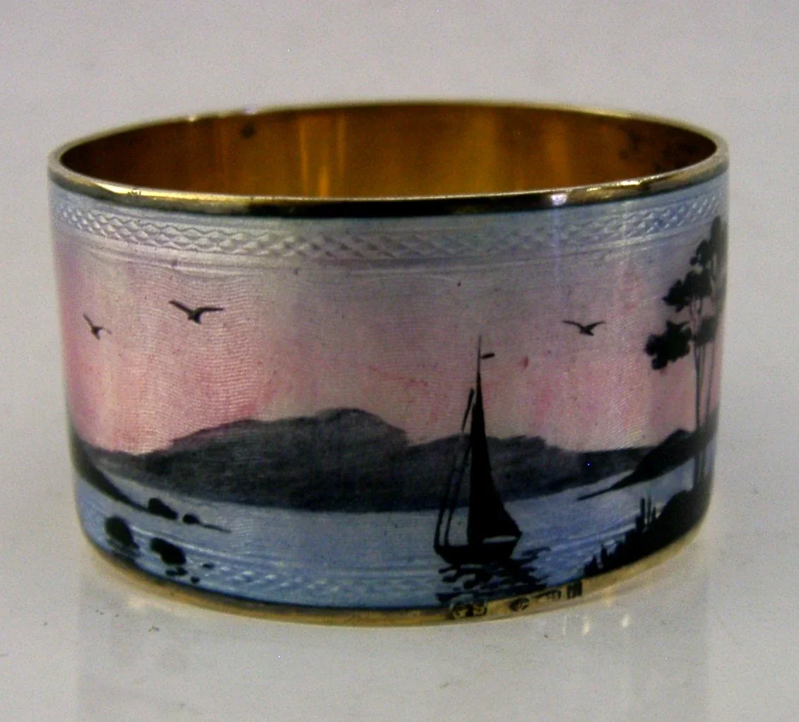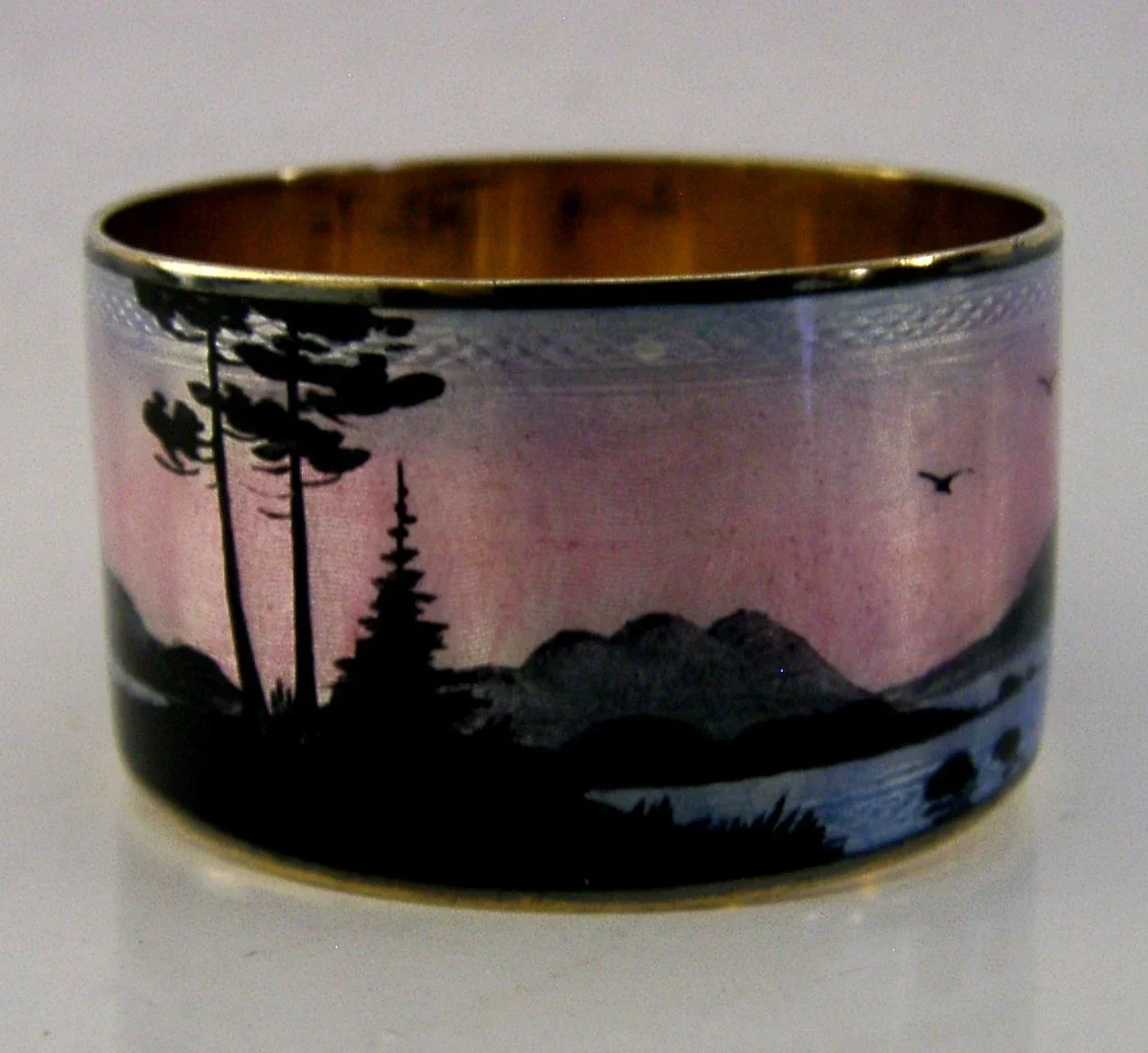 A beautifully rare Norwegian solid silver napkin ring. It is hallmarked with English import marks for London 1928 with the importer being Stockwell & Co (George Stockwell). It has been superbly designed being enamelled depicting a landscape scene. It is in superb condition being free from dings splits chips cracks and repairs. It measures approx. 1.75 inches (4.6cm) across by 1 inch (2.6cm) tall and weighs 24 grams. A superbly made very high-quality piece.