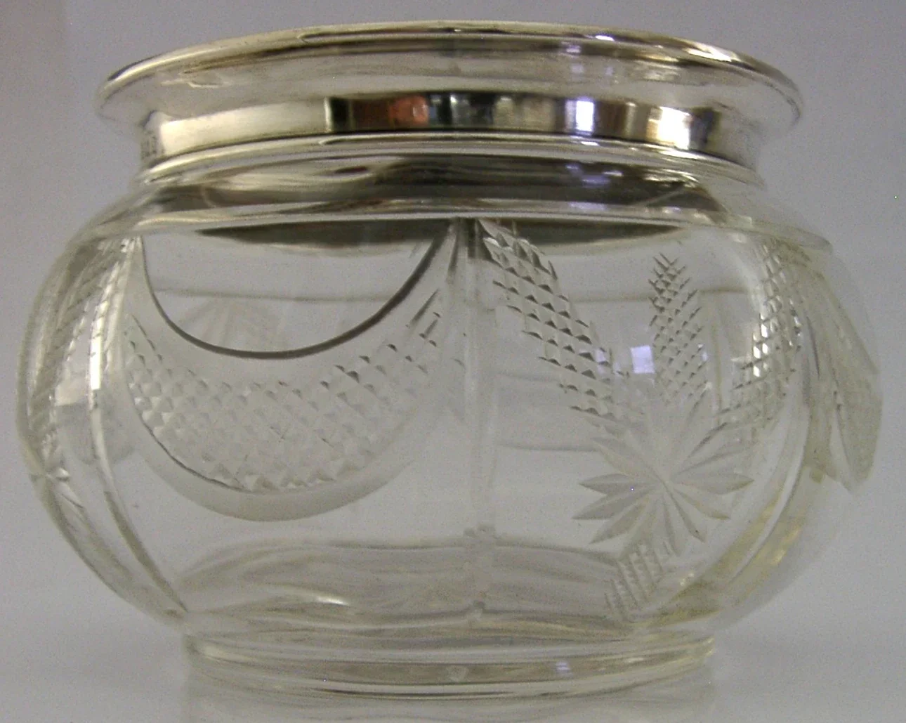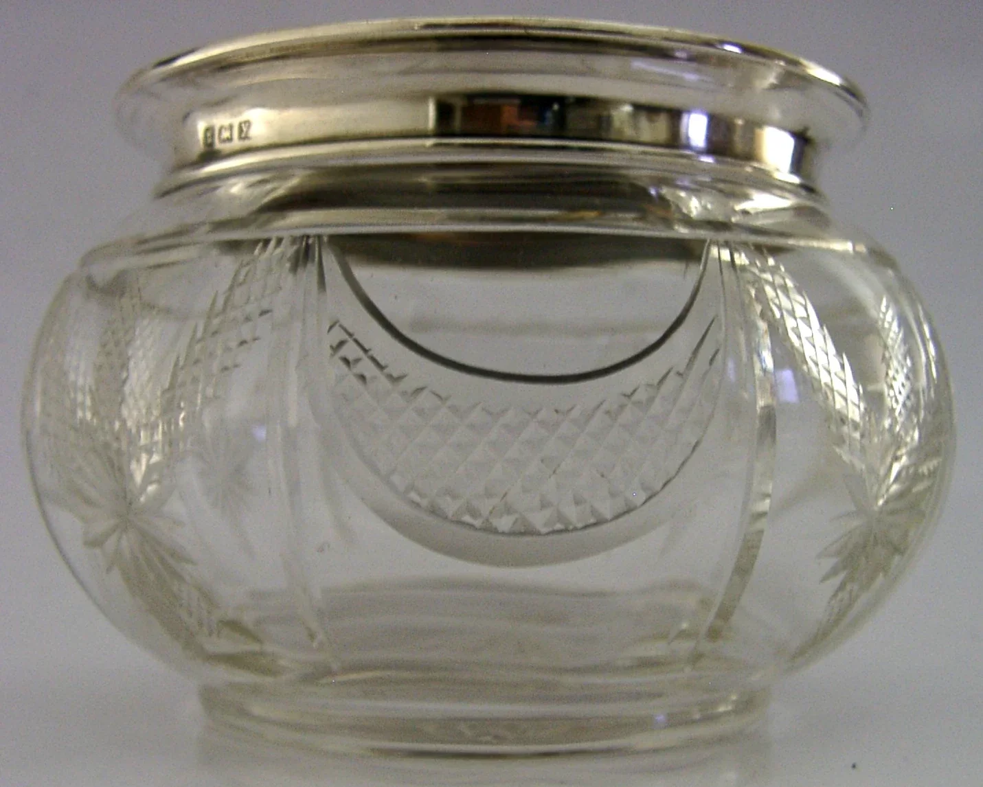 A nice quality English solid sterling silver and cut glass pot. It is hallmarked for Birmingham 1923 with the makers mark being rubbed. It has been beautifully made being having a faux tortoiseshell and silver lid. It is in super condition. The silver is free from dings splits repairs and dings. The glass is free from cracks chips and repairs. The lid is tight fitting. It is a good size measuring approx. 4 inches (10.2cm) wide across at its widest point by 2.75 inches (7cm) tall and weighs 194 grams. A beautifully made piece.
