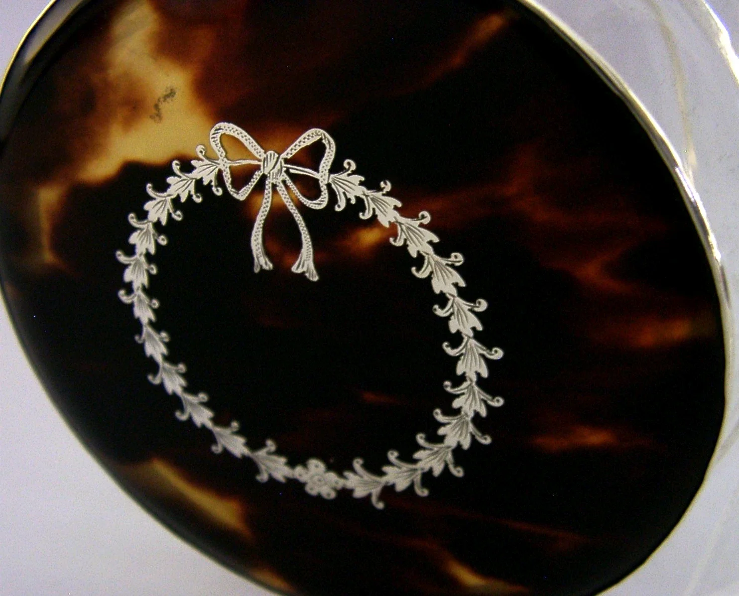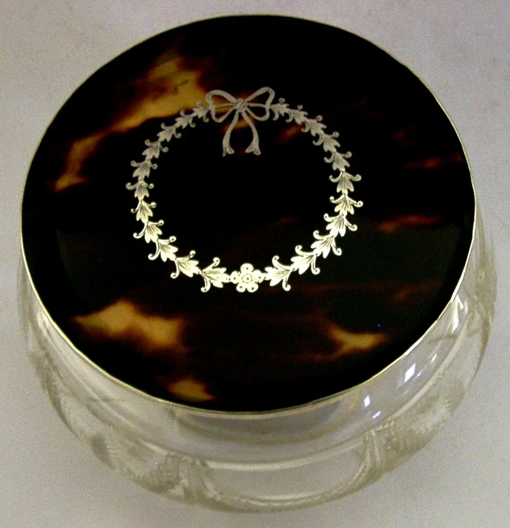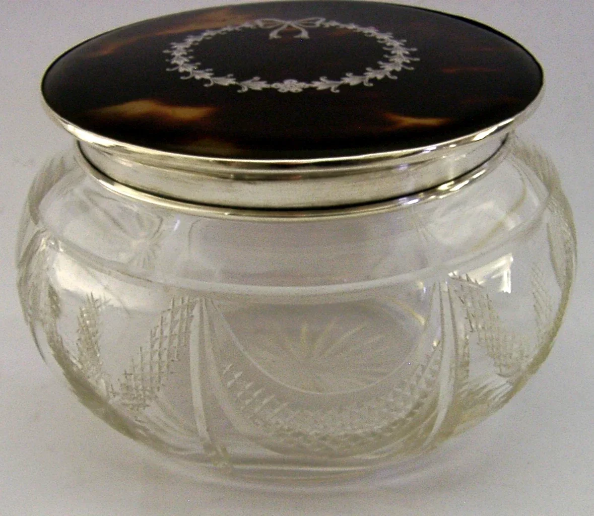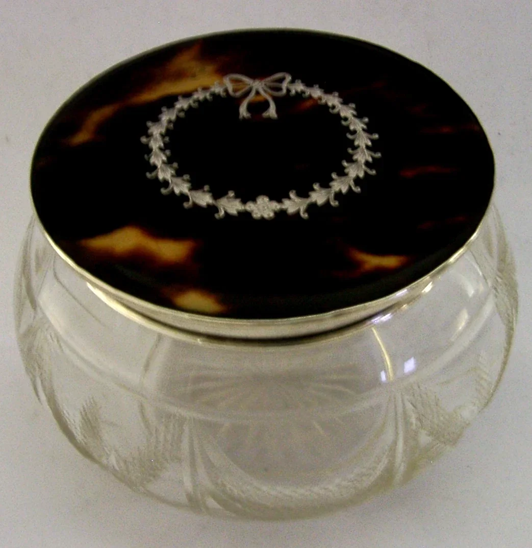 LARGE STERLING SILVER CUT GLASS FAUX TORTOISESHELL POT JAR 1923 ART DECO