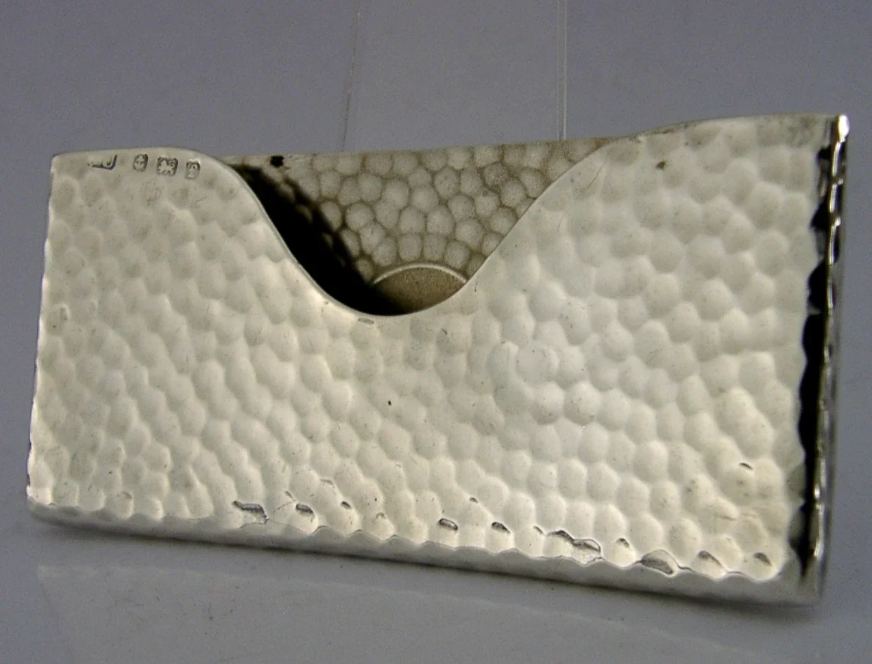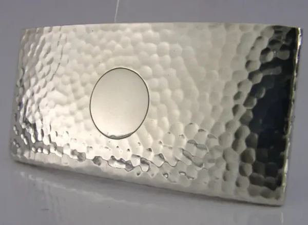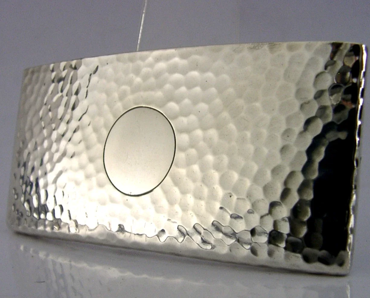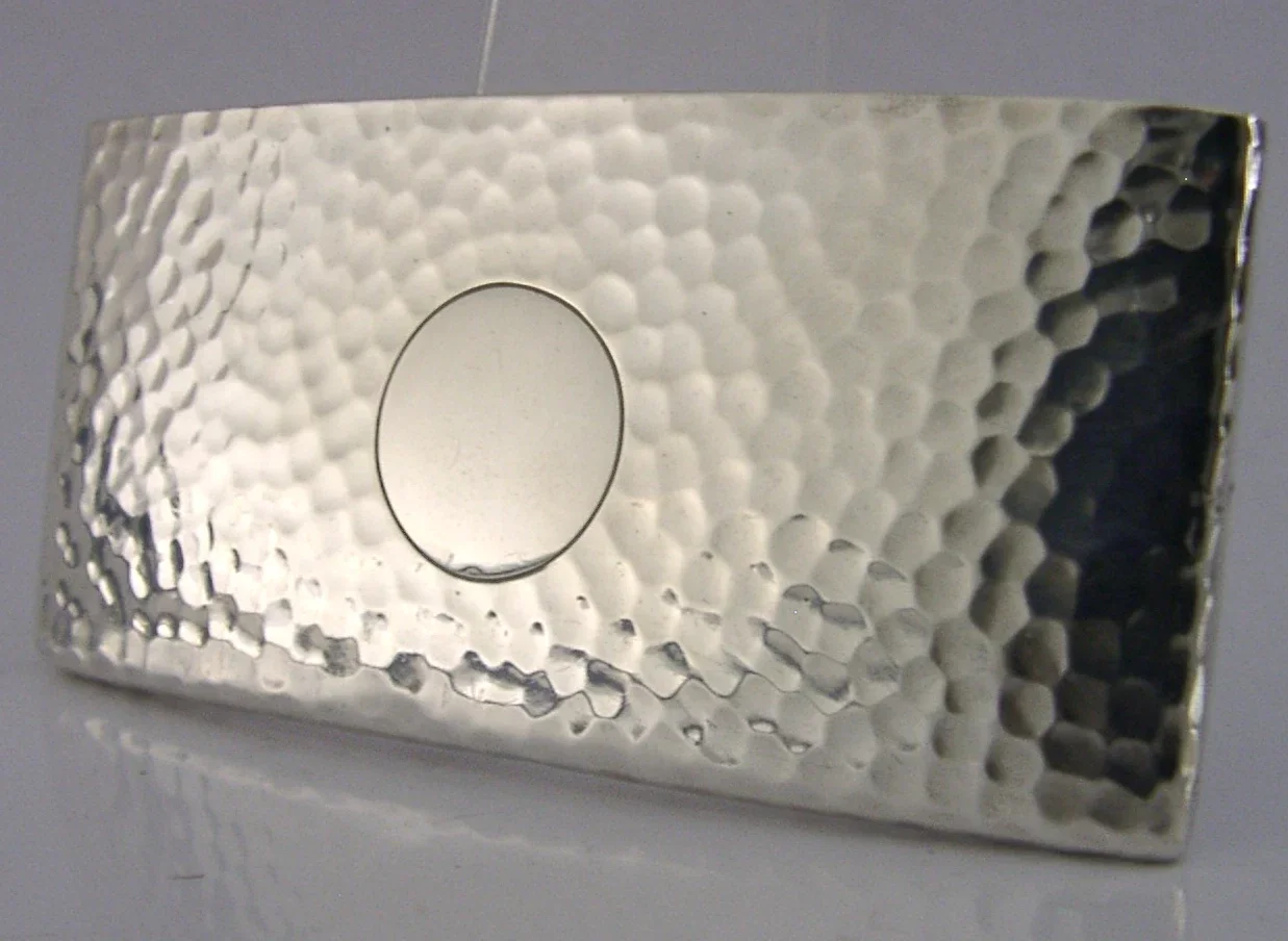 A lovely Arts & Crafts English antique solid sterling silver card case. It is hallmarked for Birmingham 1905 with the maker being George Unite. It has been superbly made being planished and the cartouche is free from any engravings. It is in superb condition being free from dings splits holes and repairs. It measures over 3.25 inches (8.4cm) long by over 1.5 inches (4cm) tall and weighs 28 grams (you can get cards made to measure online). A superbly designed beautifully clean example.