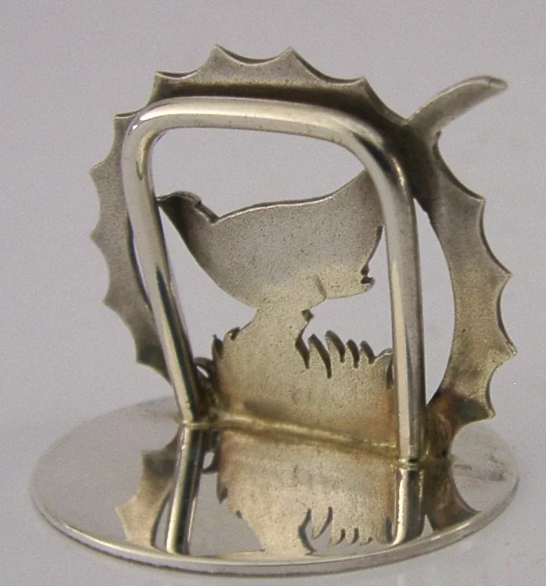 A quality English antique solid sterling silver menu holder. It is hallmarked for London 1993 with the maker being J A Campbell. It has been beautifully designed being pierced and engraved with a pheasant. It is in super condition being free from dings splits and repairs. It measures approx. 1.25 inches (3.2cm) tall by 1.25 inches (3.2cm) across the base and weighs 12 grams. A very nice quality piece.